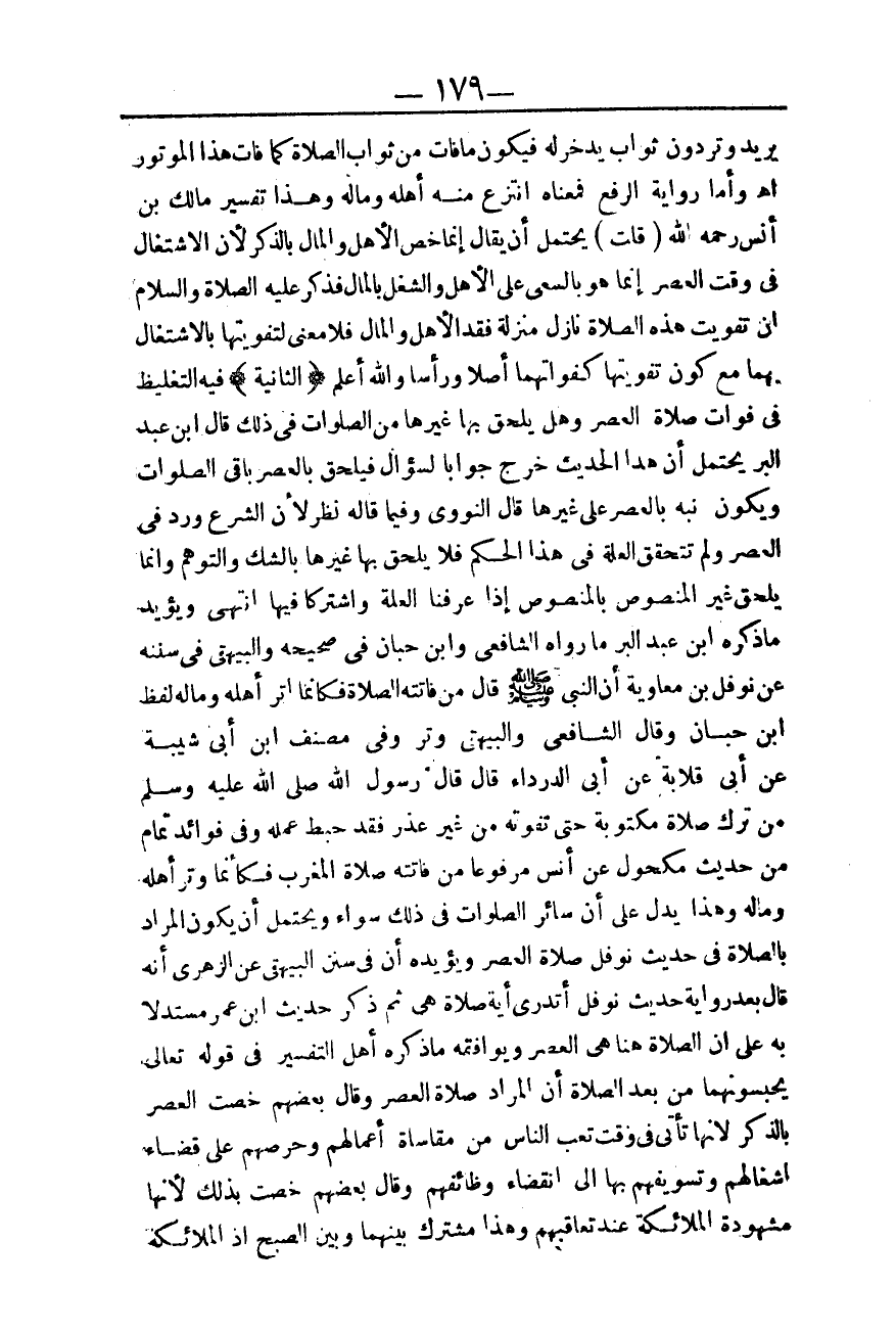 وَيُؤَيِّدُ مَا ذَكَرَهُ ابْنُ عَبْدِ الْبَرِّ مَا رَوَاهُ الشَّافِعِيُّ وَابْنُ حِبَّانَ فِي صَحِيحِهِ، وَالْبَيْهَقِيُّ فِي سُنَنِهِ عَنْ نَوْفَلِ بْنِ مُعَاوِيَةَ أَنَّ النَّبِيَّ - صَلَّى اللَّهُ عَلَيْهِ وَسَلَّمَ - قَالَ: «مَنْ فَاتَتْهُ الصَّلَاةُ فَكَأَنَّمَا أُتِرَ أَهْلَهُ، وَمَالَهُ» لَفْظُ ابْنِ حِبَّانَ.