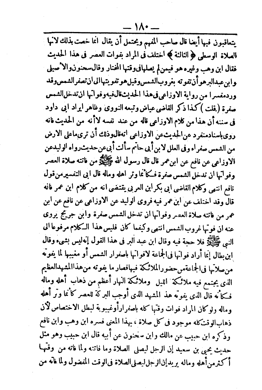 وَكَلَامُ الْقَاضِي أَبِي بَكْرِ بْنِ الْعَرَبِيِّ يَقْتَضِي أَنَّهُ مِنْ كَلَامِ ابْنِ عُمَرَ، فَإِنَّهُ قَالَ: وَقَدْ اُخْتُلِفَ عَنْ ابْنِ عُمَرَ فِيهِ فَرَوَى الْوَلِيدُ عَنْ الْأَوْزَاعِيِّ عَنْ نَافِعٍ عَنْ ابْنِ عُمَرَ مَنْ فَاتَتْهُ صَلَاةُ الْعَصْرِ وَفَوَاتُهَا أَنْ تَدْخُلَ الشَّمْسَ صُفْرَةٌ وَابْنُ جُرَيْجٍ يَرْوِي عَنْهُ أَنَّ فَوْتَهَا غُرُوبُ الشَّمْسِ انْتَهَى.