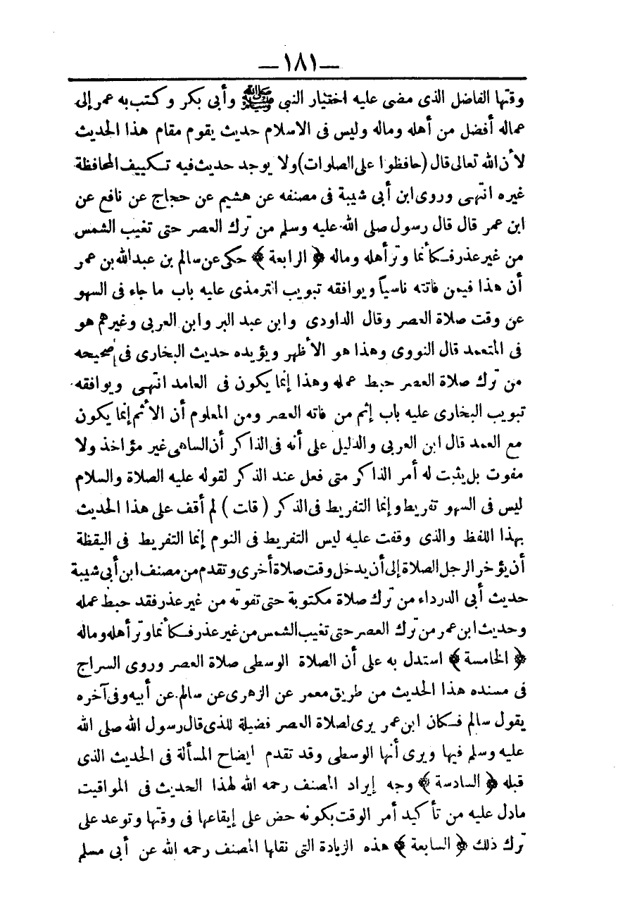 وَرَوَى ابْنُ أَبِي شَيْبَةَ فِي مُصَنَّفِهِ عَنْ هُشَيْمِ عَنْ حَجَّاجٍ عَنْ نَافِعٍ عَنْ ابْنِ عُمَرَ قَالَ قَالَ رَسُولُ اللَّهِ: - صَلَّى اللَّهُ عَلَيْهِ وَسَلَّمَ - «مَنْ تَرَكَ الْعَصْرَ حَتَّى تَغِيبَ الشَّمْسُ مِنْ غَيْرِ عُذْرٍ فَكَأَنَّمَا وُتِرَ أَهْلَهُ، وَمَالَهُ» (الرَّابِعَةُ) حُكِيَ عَنْ سَالِمِ بْنِ عَبْدِ اللَّهِ بْنِ عُمَرَ أَنَّ هَذَا فِيمَنْ فَاتَتْهُ نَاسِيًا وَيُوَافِقُهُ تَبْوِيبُ التِّرْمِذِيِّ عَلَيْهِ بَابَ مَا جَاءَ فِي السَّهْوِ عَنْ وَقْتِ صَلَاةِ الْعَصْرِ.