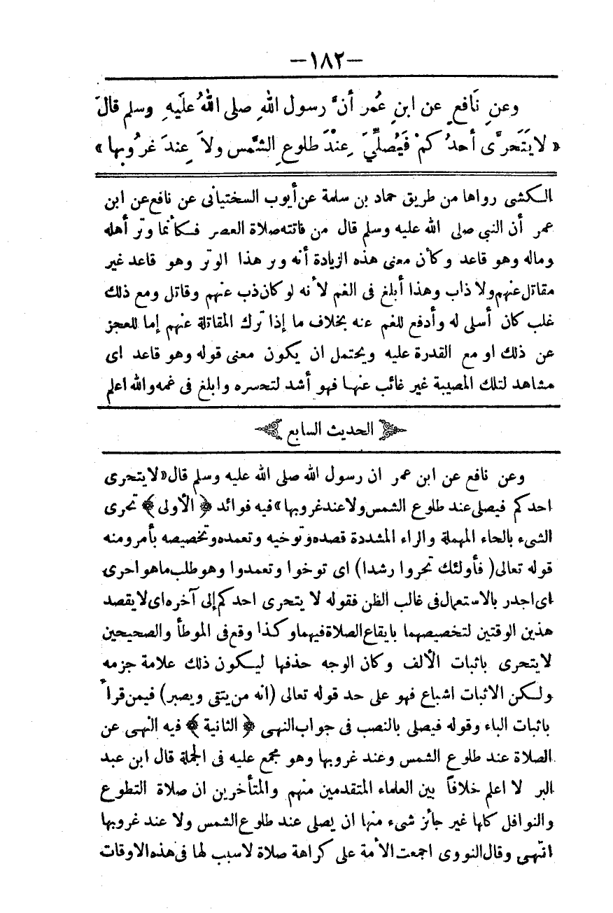 (الْحَدِيثُ السَّابِعُ) وَعَنْ نَافِعٍ عَنْ ابْنِ عُمَرَ أَنَّ رَسُولَ اللَّهِ - صَلَّى اللَّهُ عَلَيْهِ وَسَلَّمَ - قَالَ: «لَا يَتَحَرَّى أَحَدُكُمْ فَيُصَلِّيَ عِنْدَ طُلُوعِ الشَّمْسِ وَلَا عِنْدَ غُرُوبِهَا» فِيهِ فَوَائِدُ: