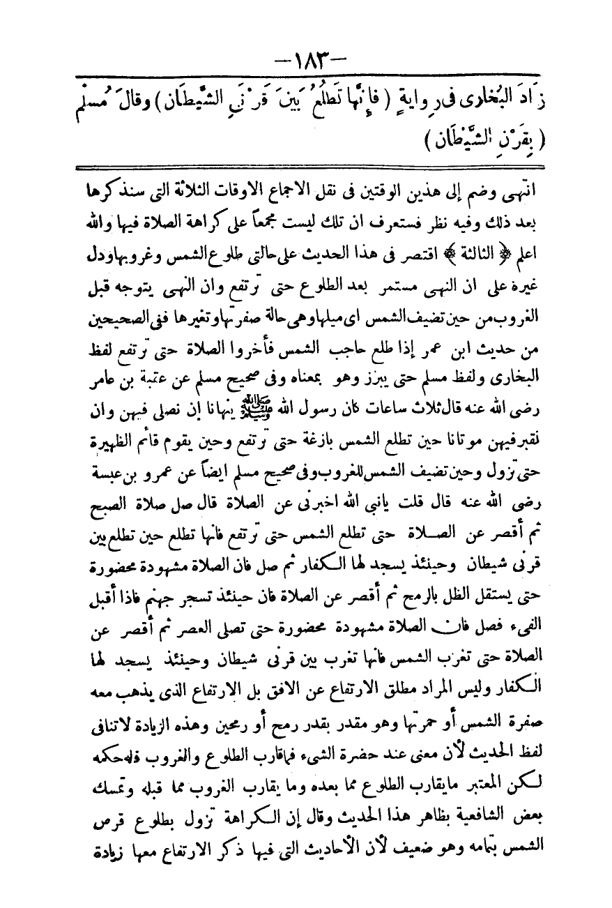 وَفِي صَحِيحِ مُسْلِمٍ عَنْ عُقْبَةَ بْنِ عَامِرٍ - رَضِيَ اللَّهُ عَنْهُ - قَالَ: «ثَلَاثُ سَاعَاتٍ كَانَ رَسُولُ اللَّهِ - صَلَّى اللَّهُ عَلَيْهِ وَسَلَّمَ - يَنْهَانَا أَنْ نُصَلِّيَ فِيهِنَّ، وَأَنْ نَقْبُرَ فِيهِنَّ مَوْتَانَا حِينَ تَطْلُعُ الشَّمْسُ بَازِغَةً حَتَّى تَرْتَفِعَ وَحِينَ يَقُومُ قَائِمُ الظَّهِيرَةِ حَتَّى تَزُولَ وَحِينَ تَضَيَّفُ الشَّمْسُ لِلْغُرُوبِ» وَفِي صَحِيحِ مُسْلِمٍ أَيْضًا عَنْ عَمْرِو بْنِ عَبَسَةَ - رَضِيَ اللَّهُ عَنْهُ - قَالَ «قُلْت يَا نَبِيَّ اللَّهِ أَخْبِرْنِي عَنْ الصَّلَاةِ قَالَ صَلِّ صَلَاةَ الصُّبْحِ، ثُمَّ أَقْصِرْ عَنْ الصَّلَاةِ حَتَّى تَطْلُعَ الشَّمْسُ حَتَّى تَرْتَفِعَ، فَإِنَّهَا تَطْلُعُ حِينَ تَطْلُعُ بَيْنَ قَرْنَيْ شَيْطَانٍ وَحِينَئِذٍ يَسْجُدُ لَهَا الْكُفَّارُ، ثُمَّ صَلِّ، فَإِنَّ الصَّلَاةَ مَشْهُودَةٌ مَحْضُورَةٌ حَتَّى يَسْتَقِلَّ الظِّلُّ بِالرُّمْحِ، ثُمَّ أَقْصِرْ عَنْ الصَّلَاةِ، فَإِنَّ حِينَئِذٍ تُسْجَرُ جَهَنَّمُ، فَإِذَا أَقْبَلَ الْفَيْءُ فَصَلِّ، فَإِنَّ الصَّلَاةَ مَشْهُودَةٌ مَحْضُورَةٌ حَتَّى تُصَلِّيَ الْعَصْرَ، ثُمَّ أَقْصِرْ عَنْ الصَّلَاةِ حَتَّى تَغْرُبَ الشَّمْسُ، فَإِنَّهَا تَغْرُبُ بَيْنَ قَرْنَيْ شَيْطَانٍ وَحِينَئِذٍ يَسْجُدُ لَهَا الْكُفَّارُ» وَلَيْسَ الْمُرَادُ مُطْلَقُ الِارْتِفَاعِ عَنْ الْأُفُقِ بَلْ الِارْتِفَاعُ الَّذِي يَذْهَبُ مَعَهُ صُفْرَةُ الشَّمْسِ أَوْ حُمْرَتُهَا، وَهُوَ مُقَدَّرٌ بِقَدْرِ رُمْحٍ أَوْ رُمْحَيْنِ، وَهَذِهِ الزِّيَادَةُ لَا تُنَافِي لَفْظَ الْحَدِيثِ؛ لِأَنَّ مَعْنَى عِنْدَ حَضْرَةُ الشَّيْءِ فَمَا قَارَبَ الطُّلُوعَ، وَالْغُرُوبَ فَلَهُ حُكْمُهُ لَكِنَّ الْمُعْتَبَرَ مَا يُقَارِبُ الطُّلُوعَ مِمَّا بَعْدَهُ، وَمَا يُقَارِبُ الْغُرُوبَ مِمَّا قَبْلَهُ وَتَمَسَّكَ بَعْضُ الشَّافِعِيَّةِ بِظَاهِرِ هَذَا الْحَدِيثِ وَقَالَ: إنَّ الْكَرَاهَةَ تَزُولُ بِطُلُوعِ قُرْصِ الشَّمْسِ بِتَمَامِهِ وَهُوَ ضَعِيفٌ؛ لِأَنَّ الْأَحَادِيثَ الَّتِي فِيهَا ذِكْرُ الِارْتِفَاعِ مَعَهَا زِيَادَةُ