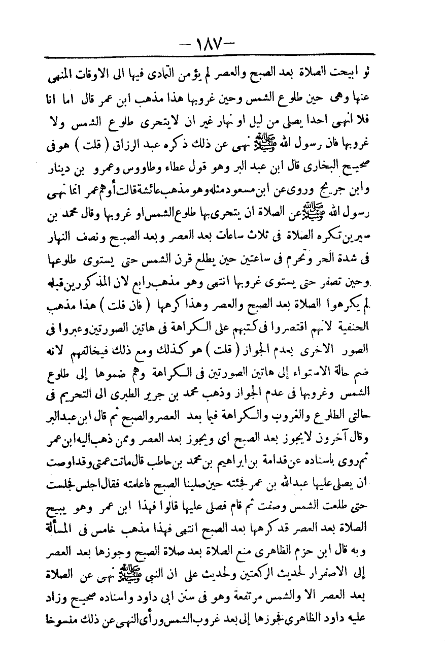 وَذَهَبَ مُحَمَّدُ بْنُ جَرِيرٍ الطَّبَرِيُّ إلَى التَّحْرِيمِ فِي حَالَتَيْ الطُّلُوعِ وَالْغُرُوبِ، وَالْكَرَاهَةِ فِيمَا بَعْدَ الْعَصْرِ، وَالصُّبْحِ، ثُمَّ قَالَ ابْنُ عَبْدِ الْبَرِّ وَقَالَ آخَرُونَ: لَا يَجُوزُ بَعْدَ الصُّبْحِ أَيْ وَيَجُوزُ بَعْدَ الْعَصْرِ وَمِمَّنْ ذَهَبَ إلَيْهِ ابْنُ عُمَرَ، ثُمَّ رَوَى بِإِسْنَادِهِ عَنْ قُدَامَةَ بْنِ إبْرَاهِيمَ بْنِ مُحَمَّدِ بْنِ حَاطِبٍ قَالَ مَاتَتْ عَمَّتِي، وَقَدْ أَوْصَتْ أَنْ يُصَلِّيَ عَلَيْهَا عَبْدُ اللَّهِ بْنُ عُمَرَ فَجِئْته حِينَ صَلَّيْنَا الصُّبْحَ فَأَعْلَمْته فَقَالَ اجْلِسْ فَجَلَسْت حَتَّى طَلَعَتْ الشَّمْسُ وَصَفَتْ، ثُمَّ قَامَ فَصَلَّى عَلَيْهَا قَالُوا فَهَذَا ابْنُ عُمَرَ، وَهُوَ يُبِيحُ الصَّلَاةَ بَعْدَ الْعَصْرِ قَدْ كَرِهَهَا بَعْدَ الصُّبْحِ انْتَهَى.