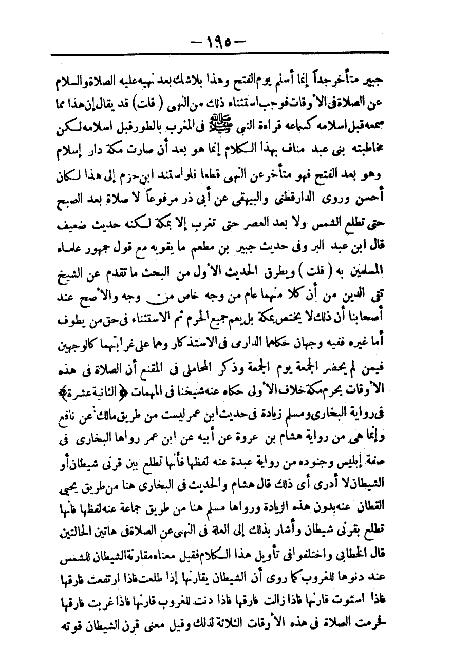 ـــــــــــــــــــــــــــــQجُبَيْرٍ مُتَأَخِّرٌ جِدًّا إنَّمَا أَسْلَمَ يَوْمَ الْفَتْحِ، وَهَذَا بِلَا شَكٍّ بَعْدَ نَهْيِهِ - عَلَيْهِ الصَّلَاةُ وَالسَّلَامُ - عَنْ الصَّلَاةِ فِي الْأَوْقَاتِ فَوَجَبَ اسْتِثْنَاءُ ذَلِكَ مِنْ النَّهْيِ.