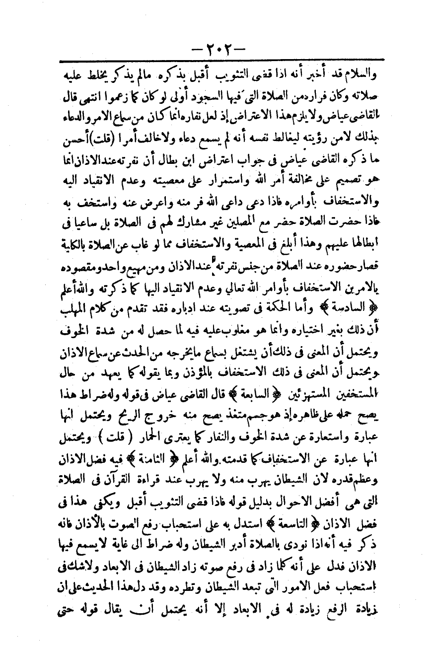 قَالَ الْقَاضِي عِيَاضٌ: وَلَا يَلْزَمُ هَذَا الِاعْتِرَاضُ إذْ لَعَلَّ نِفَارُهُ إنَّمَا كَانَ مِنْ سَمَاعِ الْأَمْرِ وَالدُّعَاءِ بِذَلِكَ لَا مِنْ رُؤْيَتِهِ لِيُغَالِطَ نَفْسَهُ أَنَّهُ لَمْ يَسْمَعْ دُعَاءً وَلَا خَالَفَ أَمْرًا (قُلْت) : أَحْسَنُ مَا ذَكَرَهُ الْقَاضِي عِيَاضٌ فِي جَوَابِ اعْتِرَاضِ ابْنِ بَطَّالٍ أَنَّ نَفْرَتَهُ عِنْدَ الْأَذَانِ إنَّمَا هُوَ تَصْمِيمٌ عَلَى مُخَالَفَةِ أَمْرِ اللَّهِ وَاسْتِمْرَارٌ عَلَى مَعْصِيَتِهِ وَعَدَمِ الِانْقِيَادِ إلَيْهِ وَالِاسْتِخْفَافِ بِأَوَامِرِهِ فَإِذَا دَعَا دَاعِي اللَّهِ فَرَّ مِنْهُ وَأَعْرَضَ عَنْهُ وَاسْتَخَفَّ بِهِ فَإِذَا حَضَرَتْ الصَّلَاةُ حَضَرَ مَعَ الْمُصَلِّينَ غَيْرَ مُشَارِكٍ لَهُمْ فِي الصَّلَاةِ بَلْ سَاعِيًا فِي إبْطَالِهَا عَلَيْهِمْ، وَهَذَا أَبْلَغُ فِي الْمَعْصِيَةِ وَالِاسْتِخْفَافِ مِمَّا لَوْ غَابَ عَنْ الصَّلَاةِ بِالْكُلِّيَّةِ فَصَارَ حُضُورُهُ عِنْدَ الصَّلَاةِ مِنْ جِنْسِ نَفْرَتِهِ عِنْدَ الْأَذَانِ وَمِنْ مَهِيعٍ وَاحِدٍ.