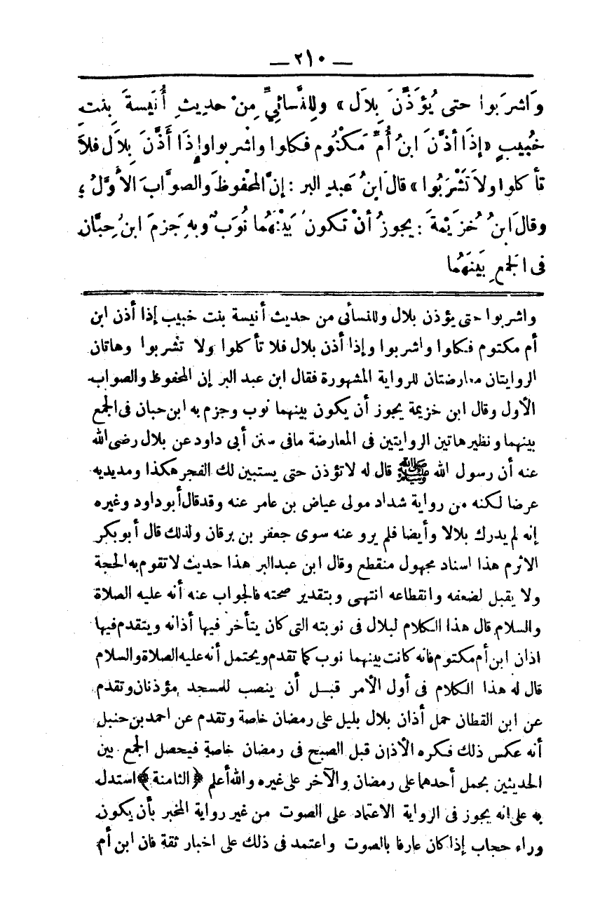 وَاشْرَبُوا حَتَّى يُؤَذِّنَ بِلَالٌ» وَلِلنَّسَائِيِّ مِنْ حَدِيثِ أُنَيْسَةَ بِنْتِ خُبَيْبِ «إذَا أَذَّنَ ابْنُ أُمِّ مَكْتُومٍ فَكُلُوا وَاشْرَبُوا وَإِذَا أَذَّنَ بِلَالٌ فَلَا تَأْكُلُوا وَلَا تَشْرَبُوا» قَالَ ابْنُ عَبْدِ الْبَرِّ: إنَّ الْمَحْفُوظَ وَالصَّوَابَ الْأَوَّلُ؛ وَقَالَ ابْنُ خُزَيْمَةَ: يَجُوزُ أَنْ تَكُونَ بَيْنَهُمَا نُوَبٌ، وَبِهِ جَزَمَ ابْنُ حِبَّانَ فِي الْجَمْعِ بَيْنَهُمَا..