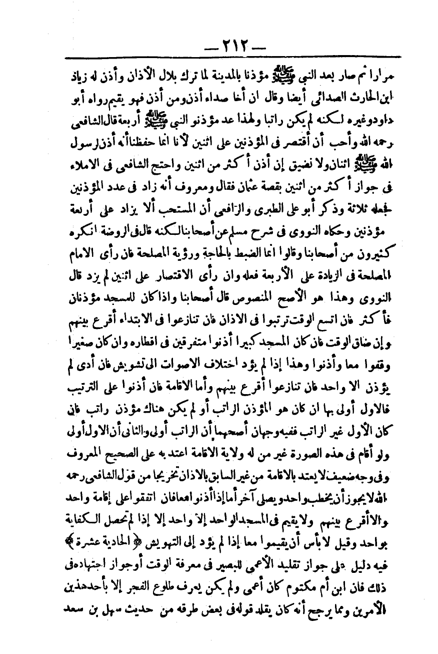 ـــــــــــــــــــــــــــــQمِرَارًا ثُمَّ صَارَ بَعْدَ النَّبِيِّ - صَلَّى اللَّهُ عَلَيْهِ وَسَلَّمَ - مُؤَذِّنًا بِالْمَدِينَةِ لَمَّا تَرَكَ بِلَالٌ الْأَذَانَ، وَأَذَّنَ لَهُ زِيَادُ بْنُ الْحَارِثِ الصُّدَائِيُّ أَيْضًا، وَقَالَ «إنَّ أَخَا صُدَاءَ أَذَّنَ، وَمَنْ أَذَّنَ فَهُوَ يُقِيمُ» رَوَاهُ أَبُو دَاوُد وَغَيْرُهُ لَكِنَّهُ لَمْ يَكُنْ رَاتِبًا وَلِهَذَا عُدَّ مُؤَذِّنُو النَّبِيِّ - صَلَّى اللَّهُ عَلَيْهِ وَسَلَّمَ - أَرْبَعَةً قَالَ الشَّافِعِيُّ - رَحِمَهُ اللَّهُ - وَأُحِبُّ أَنْ أَقْتَصِرَ فِي الْمُؤَذِّنِينَ عَلَى اثْنَيْنِ؛ لِأَنَّا إنَّمَا حَفِظْنَا أَنَّهُ أَذَّنَ لِرَسُولِ اللَّهِ - صَلَّى اللَّهُ عَلَيْهِ وَسَلَّمَ - اثْنَانِ وَلَا نُضَيِّقُ إنْ أَذَّنَ أَكْثَرُ مِنْ اثْنَيْنِ وَاحْتَجَّ الشَّافِعِيُّ فِي الْإِمْلَاءِ فِي جَوَازِ أَكْثَرَ مِنْ اثْنَيْنِ بِقِصَّةِ عُثْمَانَ فَقَالَ: وَمَعْرُوفٌ أَنَّهُ زَادَ فِي عَدَدِ الْمُؤَذِّنِينَ فَجَعَلَهُ ثَلَاثَةً وَذَكَرَ أَبُو عَلِيٍّ الطَّبَرِيُّ وَالرَّافِعِيُّ أَنَّ الْمُسْتَحَبَّ أَلَّا يُزَادَ عَلَى أَرْبَعَةِ مُؤَذِّنِينَ وَحَكَاهُ النَّوَوِيُّ فِي شَرْحِ مُسْلِمٍ عَنْ أَصْحَابِنَا لَكِنَّهُ قَالَ فِي الرَّوْضَةِ أَنْكَرَهُ كَثِيرُونَ مِنْ أَصْحَابِنَا.