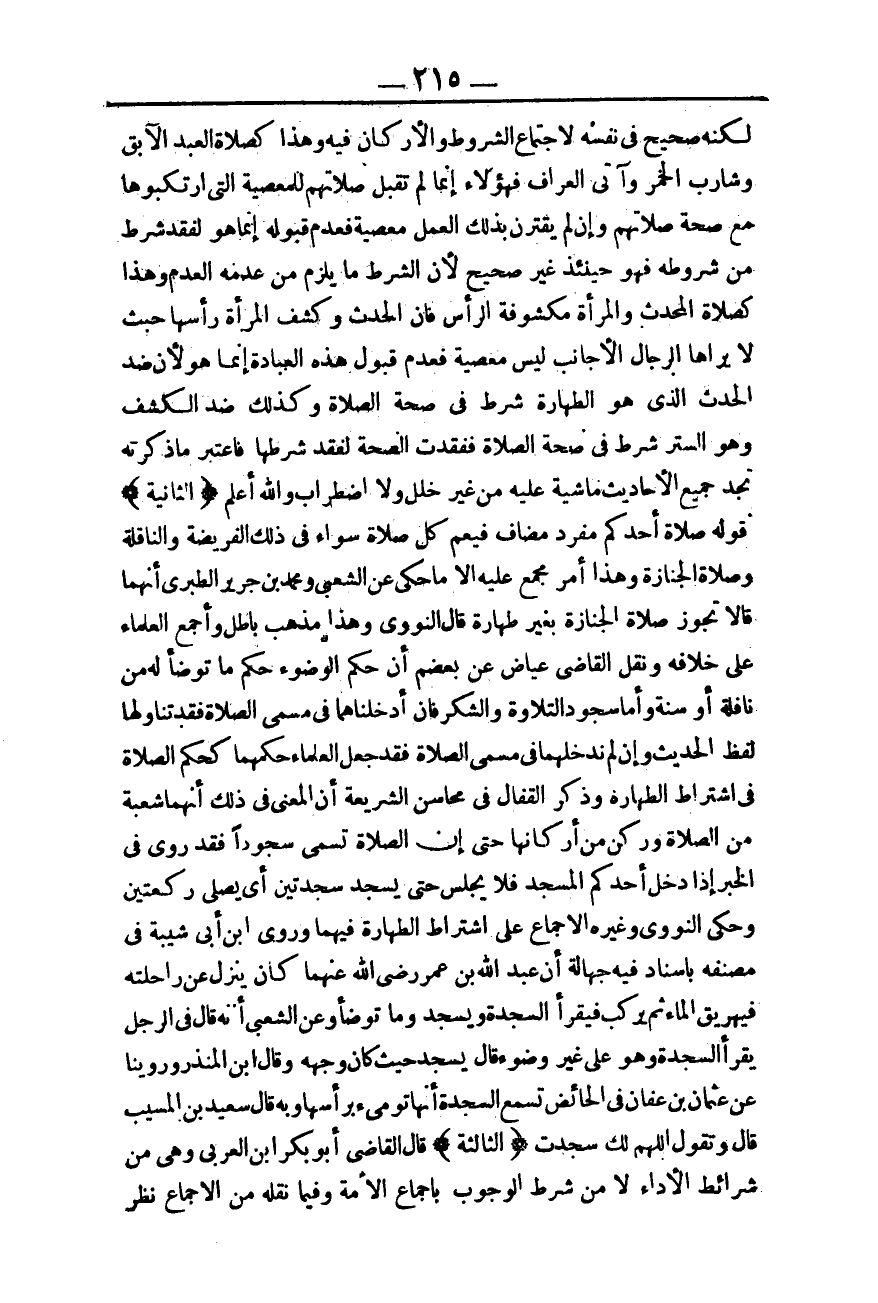 وَحَكَى النَّوَوِيُّ وَغَيْرُهُ الْإِجْمَاعَ عَلَى اشْتِرَاطِ الطَّهَارَةِ فِيهِمَا وَرَوَى ابْنُ أَبِي شَيْبَةَ فِي مُصَنَّفِهِ بِإِسْنَادٍ فِيهِ جَهَالَةٌ أَنَّ عَبْدَ اللَّهَ بْنَ عُمَرَ - رَضِيَ اللَّهُ عَنْهُمَا - كَانَ يَنْزِلُ عَنْ رَاحِلَتِهِ فَيُهْرِيقُ الْمَاءَ ثُمَّ يَرْكَبُ فَيَقْرَأُ السَّجْدَةَ وَيَسْجُدُ وَمَا تَوَضَّأَ وَعَنْ الشَّعْبِيِّ أَنَّهُ قَالَ فِي الرَّجُلِ يَقْرَأُ السَّجْدَةَ وَهُوَ عَلَى غَيْرِ وُضُوءٍ قَالَ يَسْجُدُ حَيَّتْ كَانَ وَجْهُهُ.