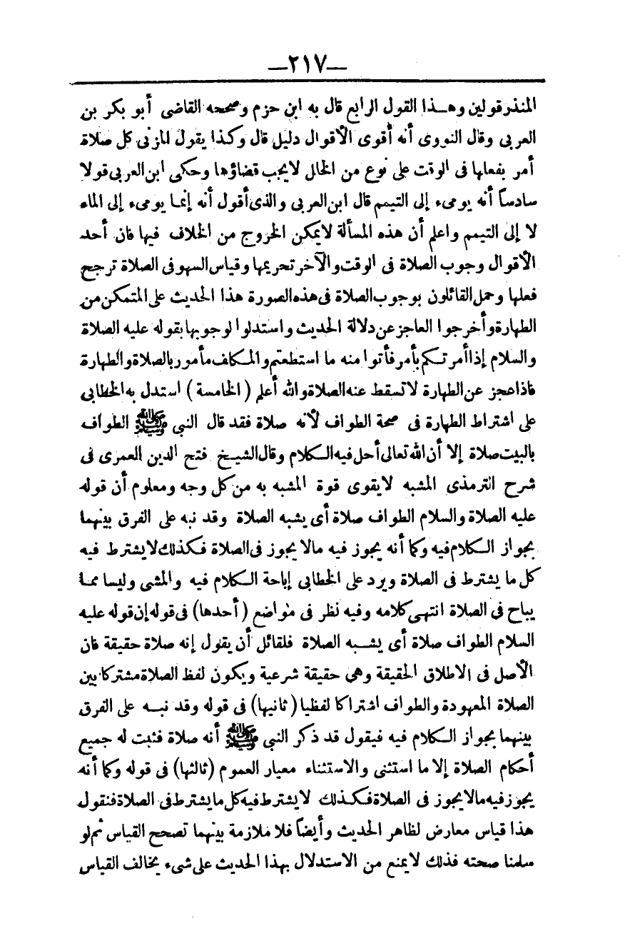 (ثَالِثُهَا) فِي قَوْلِهِ وَكَمَا أَنَّهُ يَجُوزُ فِيهِ مَا لَا يَجُوزُ فِي الصَّلَاةِ فَكَذَلِكَ لَا يُشْتَرَطُ فِيهِ كُلُّ مَا يُشْتَرَطُ فِي الصَّلَاةِ فَنَقُولُ: هَذَا قِيَاسٌ مُعَارِضٌ لِظَاهِرِ الْحَدِيثِ، وَأَيْضًا فَلَا مُلَازَمَةَ بَيْنَهُمَا تُصَحِّحُ الْقِيَاسَ ثُمَّ لَوْ سَلَّمْنَا صِحَّتَهُ فَذَلِكَ لَا يَمْنَعُ مِنْ الِاسْتِدْلَالِ بِهَذَا الْحَدِيثِ عَلَى شَيْءٍ يُخَالِفُ الْقِيَاسَ