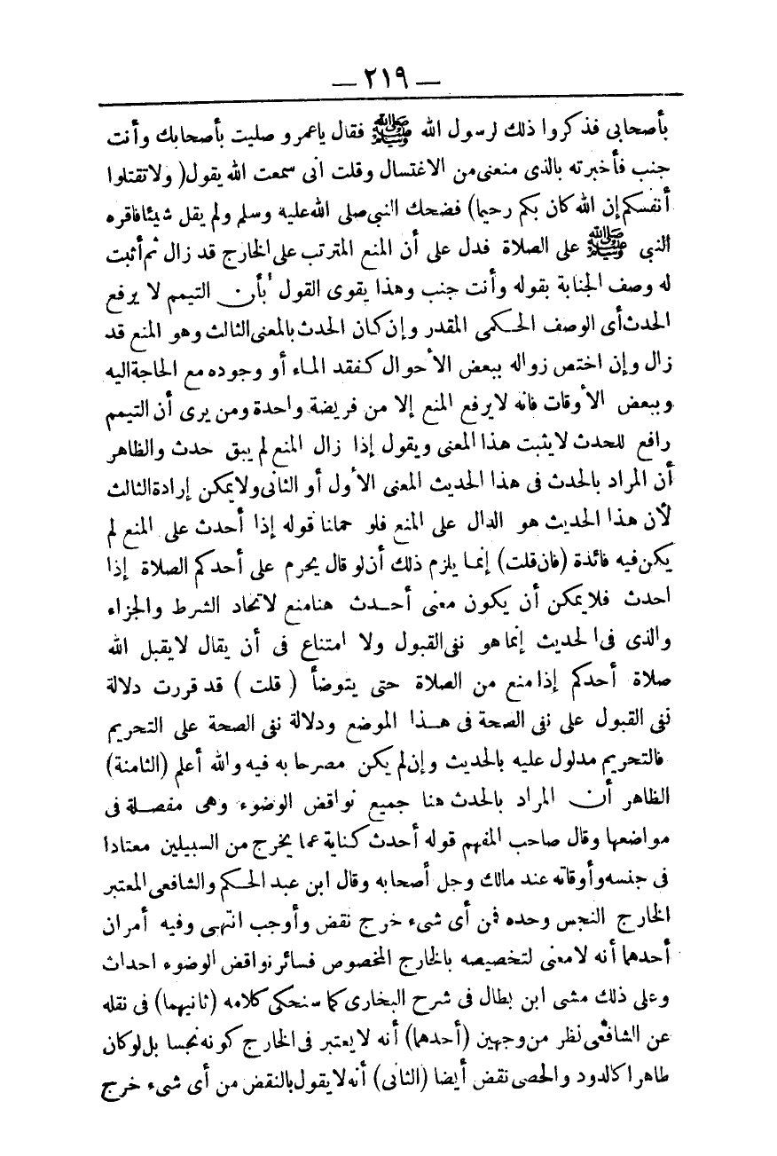 ـــــــــــــــــــــــــــــQبِأَصْحَابِي فَذَكَرُوا ذَلِكَ لِرَسُولِ اللَّهِ - صَلَّى اللَّهُ عَلَيْهِ وَسَلَّمَ - فَقَالَ يَا عَمْرُو وَصَلَّيْت بِأَصْحَابِكَ وَأَنْتَ جُنُبٌ فَأَخْبَرْته بِاَلَّذِي مَنَعَنِي مِنْ الِاغْتِسَالِ وَقُلْت إنِّي سَمِعْت اللَّهَ يَقُولُ {وَلا تَقْتُلُوا أَنْفُسَكُمْ إِنَّ اللَّهَ كَانَ بِكُمْ رَحِيمًا} [النساء: 29] فَضَحِكَ النَّبِيُّ - صَلَّى اللَّهُ عَلَيْهِ وَسَلَّمَ - وَلَمْ يَقُلْ شَيْئًا فَأَقَرَّهُ النَّبِيُّ - صَلَّى اللَّهُ عَلَيْهِ وَسَلَّمَ - عَلَى الصَّلَاةِ» فَدَلَّ عَلَى أَنَّ الْمَنْعَ الْمُتَرَتِّبَ عَلَى الْخَارِجِ قَدْ زَالَ ثُمَّ أَثْبَتَ لَهُ وَصْفَ الْجَنَابَةِ بِقَوْلِهِ وَأَنْتَ جُنُبٌ وَهَذَا يُقَوِّي الْقَوْلَ بِأَنَّ التَّيَمُّمَ لَا يَرْفَعُ الْحَدَثَ أَيْ الْوَصْفَ الْحُكْمِيَّ الْمُقَدَّرَ وَإِنْ كَانَ الْحَدَثُ بِالْمَعْنَى الثَّالِثِ وَهُوَ الْمَنْعُ قَدْ زَالَ وَإِنْ اخْتَصَّ زَوَالُهُ بِبَعْضِ الْأَحْوَالِ كَفَقْدِ الْمَاءِ أَوْ وُجُودِهِ مَعَ الْحَاجَةِ إلَيْهِ وَبِبَعْضِ الْأَوْقَاتِ فَإِنَّهُ لَا يُرْفَعُ الْمَنْعُ إلَّا مِنْ فَرِيضَةٍ وَاحِدَةٍ.
