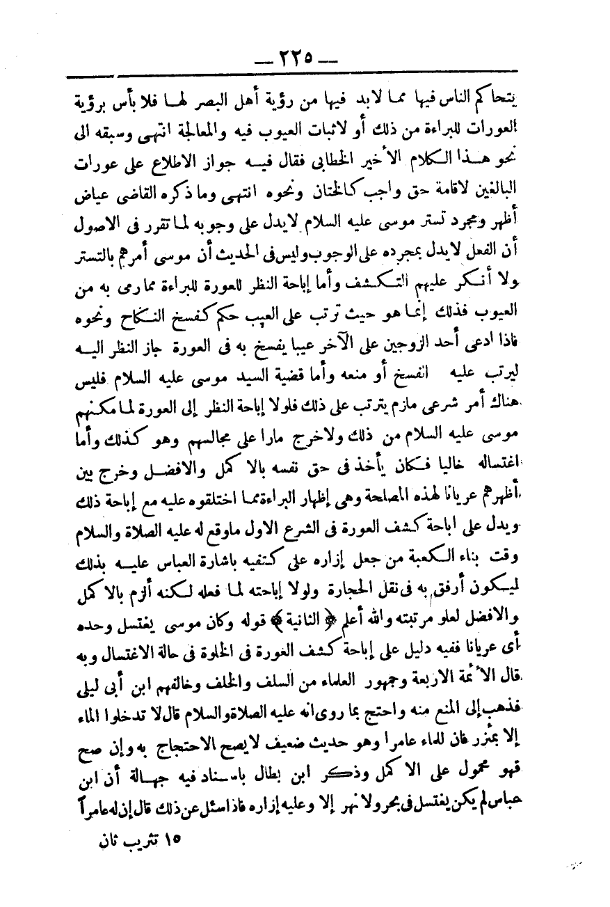 فَإِذَا ادَّعَى أَحَدُ الزَّوْجَيْنِ عَلَى الْآخَرِ عَيْبًا يَفْسَخُ بِهِ فِي الْعَوْرَةِ جَازَ النَّظَرُ إلَيْهِ لِيُرَتَّب عَلَيْهِ الْفَسْخُ أَوْ مَنْعُهُ وَأَمَّا قَضِيَّةُ السَّيِّدِ مُوسَى - عَلَيْهِ السَّلَامُ - فَلَيْسَ هُنَاكَ أَمْرٌ شَرْعِيٌّ مُلْزِمٌ يَتَرَتَّبُ عَلَى ذَلِكَ فَلَوْلَا إبَاحَةُ النَّظَرِ إلَى الْعَوْرَةِ لَمَا مَكَّنَهُمْ مُوسَى - عَلَيْهِ السَّلَامُ - مِنْ ذَلِكَ وَلَا خَرَجَ مَارًّا عَلَى مَجَالِسِهِمْ وَهُوَ كَذَلِكَ.