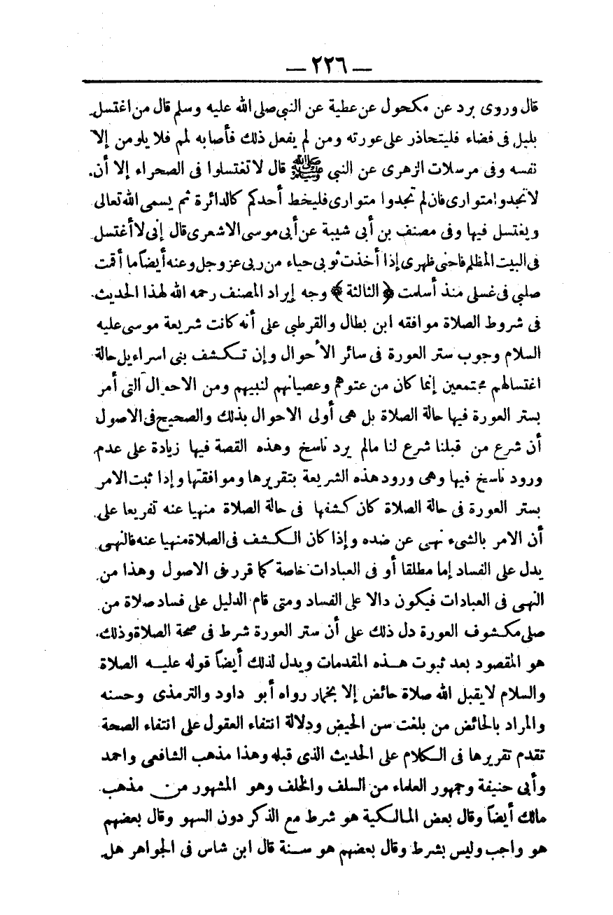 وَمَتَى قَامَ الدَّلِيلُ عَلَى فَسَادِ صَلَاةِ مَنْ صَلَّى مَكْشُوفَ الْعَوْرَةِ دَلَّ ذَلِكَ عَلَى أَنَّ سَتْرَ الْعَوْرَةِ شَرْطٌ فِي صِحَّةِ الصَّلَاةِ وَذَلِكَ هُوَ الْمَقْصُودُ بَعْدَ ثُبُوتِ هَذِهِ الْمُقَدَّمَاتِ وَيَدُلُّ لِذَلِكَ أَيْضًا قَوْلُهُ - عَلَيْهِ الصَّلَاةُ وَالسَّلَامُ - «لَا يَقْبَلُ اللَّهُ صَلَاةَ حَائِضٍ إلَّا بِخِمَارٍ» رَوَاهُ أَبُو دَاوُد وَالتِّرْمِذِيُّ وَحَسَّنَهُ وَالْمُرَادُ بِالْحَائِضِ مَنْ بَلَغَتْ سِنَّ الْحَيْضِ وَدَلَالَةُ انْتِفَاءِ الْعُقُولِ عَلَى انْتِفَاءِ الصِّحَّةِ تَقَدَّمَ تَقْرِيرُهَا فِي الْكَلَامِ عَلَى الْحَدِيثِ الَّذِي قَبْلَهُ.