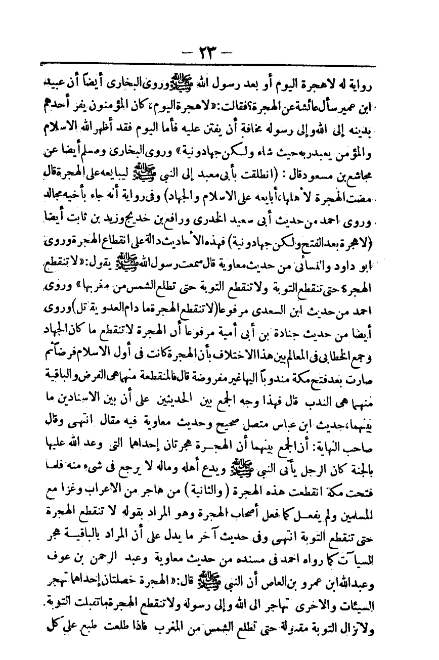 وَرَوَى أَحْمَدُ مِنْ حَدِيثِ أَبِي سَعِيدٍ الْخُدْرِيِّ وَرَافِعِ بْنِ خَدِيجٍ وَزَيْدِ بْنِ ثَابِتٍ أَيْضًا «لَا هِجْرَةَ بَعْدَ الْفَتْحِ وَلَكِنْ جِهَادٌ وَنِيَّةٌ» فَهَذِهِ الْأَحَادِيثُ دَالَّةٌ عَلَى انْقِطَاعِ الْهِجْرَةِ وَرَوَى أَبُو دَاوُد، وَالنَّسَائِيُّ مِنْ حَدِيثِ مُعَاوِيَةَ قَالَ سَمِعْت رَسُولَ اللَّهِ - صَلَّى اللَّهُ عَلَيْهِ وَسَلَّمَ - يَقُولُ: «لَا تَنْقَطِعُ الْهِجْرَةُ حَتَّى تَنْقَطِعَ التَّوْبَةُ وَلَا تَنْقَطِعُ التَّوْبَةُ حَتَّى تَطْلُعَ الشَّمْسُ مِنْ مَغْرِبِهَا» .