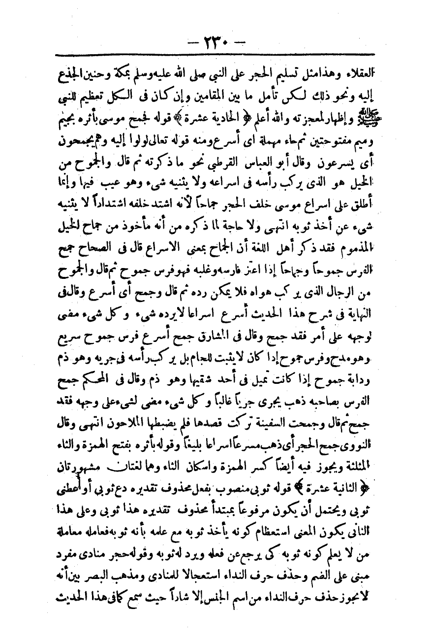 (الثَّانِيَةَ عَشْرَةَ) قَوْلُهُ: «ثَوْبِي» مَنْصُوبٌ بِفِعْلٍ مَحْذُوفٍ تَقْدِيرُهُ دَعْ ثَوْبِي أَوْ أَعْطِنِي ثَوْبِي وَيُحْتَمَلُ أَنْ يَكُونَ مَرْفُوعًا بِمُبْتَدَأٍ مَحْذُوفٍ تَقْدِيرُهُ هَذَا ثَوْبِي وَعَلَى هَذَا الثَّانِي يَكُونُ الْمَعْنَى اسْتِعْظَامَ كَوْنِهِ يَأْخُذُ ثَوْبَهُ مَعَ عِلْمِهِ بِأَنَّهُ ثَوْبُهُ فَعَامَلَهُ مُعَامَلَةَ مَنْ لَا يَعْلَمُ كَوْنَهُ ثَوْبَهُ كَيْ يَرْجِعَ عَنْ فِعْلِهِ وَيَرُدَّ لَهُ ثَوْبَهُ، وَقَوْلُهُ «حَجَرُ» مُنَادَى مُفْرَدٌ مَبْنِيٌّ عَلَى الضَّمِّ وَحُذِفَ حَرْفُ النِّدَاءِ اسْتِعْجَالًا لِلْمُنَادَى وَمَذْهَبُ الْبَصْرِيِّينَ أَنَّهُ لَا يَجُوزُ حَذْفُ حَرْفِ النِّدَاءِ مِنْ اسْمِ الْجِنْسِ إلَّا شَاذًّا حَيْثُ سُمِعَ كَمَا فِي هَذَا الْحَدِيثِ