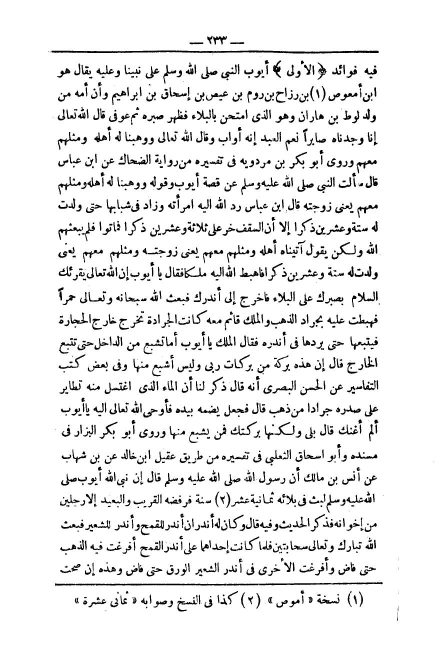 (الْأُولَى) أَيُّوبُ النَّبِيُّ - صَلَّى اللَّهُ عَلَيْهِ وَسَلَّمَ - عَلَى نَبِيِّنَا وَعَلَيْهِ يُقَالُ هُوَ ابْنُ أَمْعُوصَ بْنِ رَزَاحِ بْنِ رُومِ بْنِ عِيصَ بْنِ إِسْحَاقَ بْنِ إبْرَاهِيمَ وَأَنَّ أُمَّهُ مِنْ وَلَدِ لُوطِ بْنِ هَارُونَ وَهُوَ الَّذِي اُمْتُحِنَ بِالْبَلَاءِ فَظَهَرَ صَبْرُهُ ثُمَّ عُوفِيَ قَالَ اللَّهُ تَعَالَى {إِنَّا وَجَدْنَاهُ صَابِرًا نِعْمَ الْعَبْدُ إِنَّهُ أَوَّابٌ} [ص: 44] وَقَالَ اللَّهُ تَعَالَى {وَوَهَبْنَا لَهُ أَهْلَهُ وَمِثْلَهُمْ مَعَهُمْ} [ص: 43] . وَرَوَى أَبُو بَكْرِ بْنُ مَرْدُوَيْهِ فِي تَفْسِيرِهِ مِنْ رِوَايَةِ الضَّحَّاكِ عَنْ ابْنِ عَبَّاسٍ قَالَ «سَأَلْت النَّبِيَّ - صَلَّى اللَّهُ عَلَيْهِ وَسَلَّمَ - عَنْ قِصَّةِ أَيُّوبَ وَقَوْلِهِ {وَوَهَبْنَا لَهُ أَهْلَهُ وَمِثْلَهُمْ مَعَهُمْ} [ص: 43] يَعْنِي زَوْجَتَهُ قَالَ ابْنُ عَبَّاسٍ رَدَّ اللَّهُ إلَيْهِ امْرَأَتَهُ وَزَادَ فِي شَبَابِهَا حَتَّى وَلَدَتْ لَهُ سِتَّةً وَعِشْرِينَ ذَكَرًا إلَّا أَنَّ السَّقْفَ خَرَّ عَلَى ثَلَاثَةٍ وَعِشْرِينَ ذَكَرًا فَمَاتُوا فَلَمْ يَبْعَثْهُمْ اللَّهُ وَلَكِنْ يَقُولُ {وَآتَيْنَاهُ أَهْلَهُ وَمِثْلَهُمْ مَعَهُمْ} [الأنبياء: 84] يَعْنِي زَوْجَتَهُ {وَمِثْلَهُمْ مَعَهُمْ} [الأنبياء: 84] يَعْنِي وَلَدَتْ لَهُ سِتَّةً وَعِشْرِينَ ذَكَرًا فَأَهْبَطَ اللَّهُ إلَيْهِ مَلَكًا فَقَالَ يَا أَيُّوبُ إنَّ اللَّهَ تَعَالَى يُقْرِئُكَ السَّلَامَ بِصَبْرِكَ عَلَى الْبَلَاءِ فَاخْرُجْ إلَى أَنْدَرِك فَبَعَثَ اللَّهُ - سُبْحَانَهُ وَتَعَالَى - حُمُرًا فَهَبَطَتْ عَلَيْهِ بِجَرَادِ الذَّهَبِ وَالْمَلِكُ قَائِمٌ مَعَهُ كَانَتْ الْجَرَادَةُ تَخْرُجُ خَارِجَ الْحِجَارَةِ فَيَتْبَعُهَا حَتَّى يَرُدَّهَا فِي أَنْدَرِهِ فَقَالَ الْمَلِكُ يَا أَيُّوبُ أَمَا تَشْبَعُ مِنْ الدَّاخِلِ حَتَّى تَتْبَعَ الْخَارِجَ قَالَ إنَّ هَذِهِ بَرَكَةٌ مِنْ بَرَكَاتِ رَبِّي وَلَيْسَ أَشْبَعُ مِنْهَا» وَفِي بَعْضِ كُتُبِ التَّفَاسِيرِ عَنْ الْحَسَنِ الْبَصْرِيِّ أَنَّهُ قَالَ «ذَكَرَ لَنَا أَنَّ الْمَاءَ الَّذِي اغْتَسَلَ مِنْهُ تَطَايَرَ عَلَى صَدْرِهِ جَرَادًا مِنْ ذَهَبٍ قَالَ فَجَعَلَ يَضُمُّهُ بِيَدِهِ فَأَوْحَى اللَّهُ تَعَالَى إلَيْهِ يَا أَيُّوبُ أَلَمْ أُغْنِك قَالَ بَلَى وَلَكِنَّهَا بَرَكَتُك فَمَنْ يَشْبَعُ مِنْهَا» . وَرَوَى أَبُو بَكْرٍ الْبَزَّارُ فِي مُسْنَدِهِ وَأَبُو إِسْحَاقَ الثَّعْلَبِيُّ فِي تَفْسِيرِهِ مِنْ طَرِيقِ عُقَيْلِ بْنِ خَالِدٍ عَنْ ابْنِ شِهَابٍ عَنْ أَنَسِ بْنِ مَالِكٍ أَنَّ رَسُولَ اللَّهِ - صَلَّى اللَّهُ عَلَيْهِ وَسَلَّمَ - قَالَ «إنَّ نَبِيَّ اللَّهِ أَيُّوبَ - صَلَّى اللَّهُ عَلَيْهِ وَسَلَّمَ - لَبِثَ فِي بَلَائِهِ ثَمَانِيَةَ عَشَرَ سَنَةً فَرَفَضَهُ الْقَرِيبُ وَالْبَعِيدُ إلَّا رَجُلَيْنِ مِنْ إخْوَانِهِ» فَذَكَرَ الْحَدِيثَ وَفِيهِ قَالَ «وَكَانَ لَهُ أَنْدَرَانِ أَنْدَرُ لِلْقَمْحِ وَأَنْدَرُ لِلشَّعِيرِ فَبَعَثَ اللَّهُ تَبَارَكَ وَتَعَالَى سَحَابَتَيْنِ فَلَمَّا كَانَتْ إحْدَاهُمَا عَلَى أَنْدَرِ الْقَمْحِ أَفْرَغَتْ فِيهِ الذَّهَبَ حَتَّى فَاضَ وَأَفْرَغَتْ الْأُخْرَى فِي أَنْدَرِ الشَّعِيرِ الْوَرِقَ حَتَّى فَاضَ» وَهَذِهِ إنْ صَحَّتْ