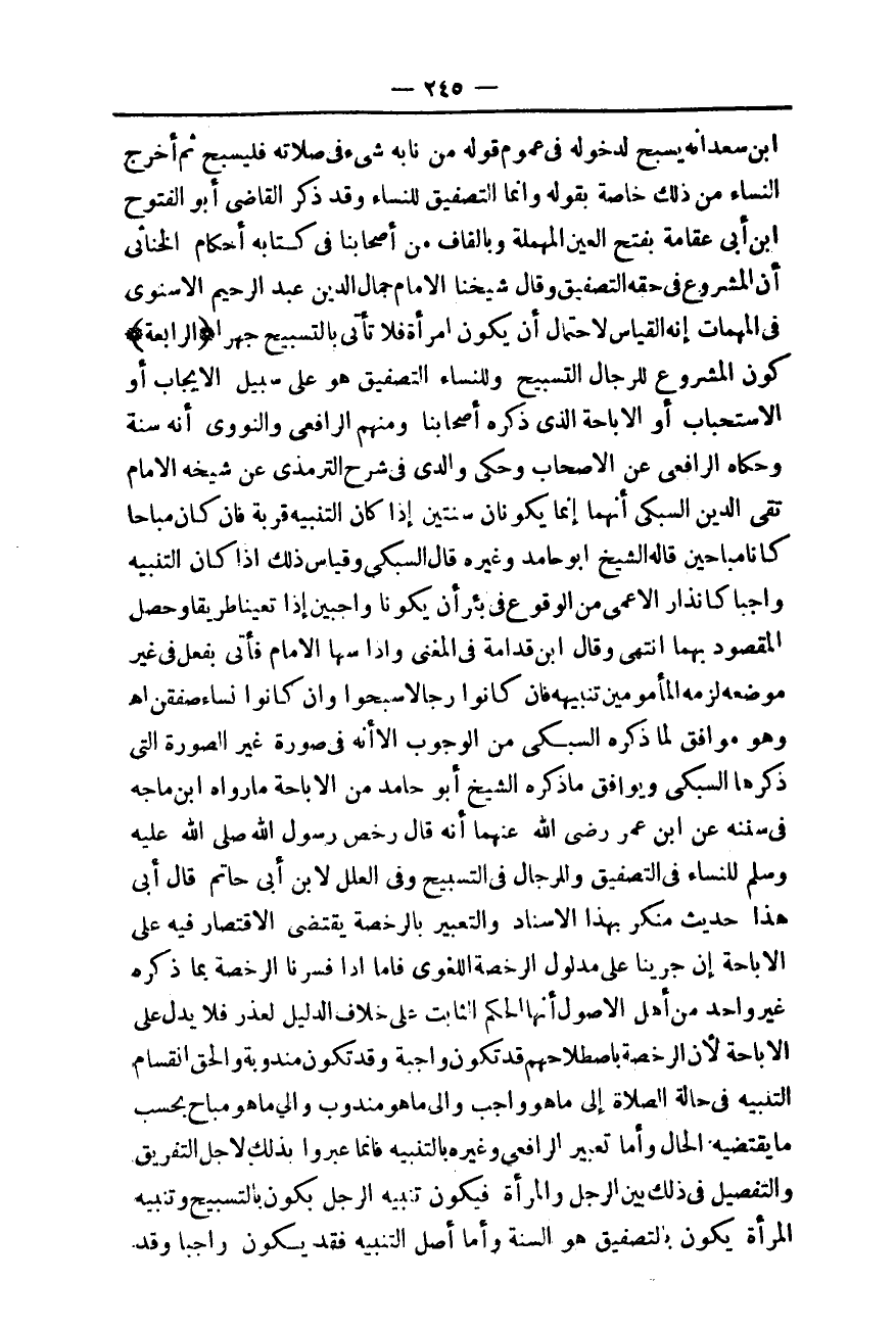 وَقَالَ ابْنُ قُدَامَةَ فِي الْمُغْنِي وَإِذَا سَهَا الْإِمَامُ فَأَتَى بِفِعْلٍ فِي غَيْرِ مَوْضِعِهِ لَزِمَ الْمَأْمُومِينَ تَنْبِيهَهُ فَإِنْ كَانُوا رِجَالًا سَبَّحُوا وَإِنْ كَانُوا نِسَاءً صَفَّقْنَ اهـ وَهُوَ مُوَافِقٌ لِمَا ذَكَرَهُ السُّبْكِيُّ مِنْ الْوُجُوبِ إلَّا أَنَّهُ فِي صُورَةٍ غَيْرِ الصُّورَةِ الَّتِي ذَكَرَهَا السُّبْكِيُّ وَيُوَافِقُ مَا ذَكَرَهُ الشَّيْخُ أَبُو حَامِدٍ مِنْ الْإِبَاحَةِ مَا رَوَاهُ ابْنُ مَاجَهْ فِي سُنَنِهِ عَنْ ابْنِ عُمَرَ - رَضِيَ اللَّهُ عَنْهُمَا - أَنَّهُ قَالَ «رَخَّصَ رَسُولُ اللَّهِ - صَلَّى اللَّهُ عَلَيْهِ وَسَلَّمَ - لِلنِّسَاءِ فِي التَّصْفِيقِ وَلِلرِّجَالِ فِي التَّسْبِيحِ» وَفِي الْعِلَلِ لِابْنِ أَبِي حَاتِمٍ قَالَ أَبِي هَذَا حَدِيثٌ مُنْكَرٌ بِهَذَا الْإِسْنَادِ وَالتَّعْبِيرُ بِالرُّخْصَةِ يَقْتَضِي الِاقْتِصَارَ فِيهِ عَلَى الْإِبَاحَةِ إنْ جَرَيْنَا عَلَى مَدْلُولِ الرُّخْصَةِ اللُّغَوِيِّ فَأَمَّا إذَا فَسَّرْنَا الرُّخْصَةَ بِمَا ذَكَرَهُ غَيْرُ وَاحِدٍ مِنْ أَهْلِ الْأُصُولِ أَنَّهَا الْحُكْمُ الثَّابِتُ عَلَى خِلَافِ الدَّلِيلِ لِعُذْرٍ فَلَا يَدُلُّ عَلَى الْإِبَاحَةِ لِأَنَّ الرُّخْصَةَ بِاصْطِلَاحِهِمْ قَدْ تَكُونُ وَاجِبَةً وَقَدْ تَكُونُ مَنْدُوبَةً وَالْحَقُّ انْقِسَامُ التَّنْبِيهِ فِي حَالَةِ الصَّلَاةِ إلَى مَا هُوَ وَاجِبٌ وَإِلَى مَا هُوَ مَنْدُوبٌ وَإِلَى مَا هُوَ مُبَاحٌ بِحَسَبِ مَا يَقْتَضِيهِ الْحَالُ وَأَمَّا تَعْبِيرُ الرَّافِعِيِّ وَغَيْرِهِ بِالتَّنْبِيهِ فَإِنَّمَا عَبَّرُوا بِذَلِكَ لِأَجْلِ التَّفْرِيقِ وَالتَّفْصِيلِ فِي ذَلِكَ بَيْنَ الرَّجُلِ وَالْمَرْأَةِ فَيَكُونُ تَنْبِيهُ الرَّجُلِ يَكُونُ بِالتَّسْبِيحِ وَتَنْبِيهُ الْمَرْأَةِ يَكُونُ بِالتَّصْفِيقِ هُوَ السُّنَّةُ وَأَمَّا أَصْلُ التَّنْبِيهِ فَقَدْ يَكُونُ وَاجِبًا وَقَدْ