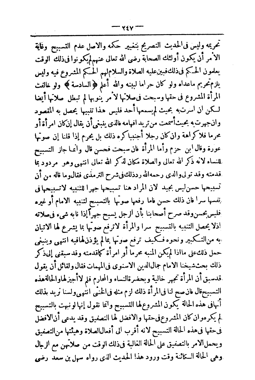 وَهُوَ مَرْدُودٌ بِمَا قَدَّمْته وَقَدْ تَوَلَّى وَالِدِي - رَحِمَهُ اللَّهُ - رَدَّ ذَلِكَ فِي شَرْحِ التِّرْمِذِيِّ فَقَالَ وَمَا قَالَهُ مِنْ أَنَّ تَسْبِيحَهَا حَسَنٌ لَيْسَ بِجَيِّدٍ لِأَنَّ الْمُرَادَ هُنَا تَسْبِيحُهَا جَهْرًا لِلتَّنْبِيهِ لَا تَسْبِيحَهَا فِي نَفْسِهَا سِرًّا فَإِنَّ ذَلِكَ حَسَنٌ فَأَمَّا رَفْعُهَا صَوْتَهَا بِالتَّسْبِيحِ لِتَنْبِيهِ الْإِمَامِ أَوْ غَيْرِهِ فَلَيْسَ بِحَسَنٍ، وَقَدْ صَرَّحَ أَصْحَابُنَا بِأَنَّ الرَّجُلَ يُسَبِّحُ جَهْرًا إذَا نَابَهُ شَيْءٌ فِي صَلَاتِهِ إذْ لَا يَحْصُلُ التَّنْبِيهُ بِالتَّسْبِيحِ سِرًّا وَالْمَرْأَةُ لَا تَرْفَعُ صَوْتَهَا بِمَا يُشْرَعُ لَهَا الْإِتْيَانُ بِهِ مِنْ التَّكْبِيرِ وَنَحْوِهِ فَكَيْفَ تَرْفَعُ صَوْتَهَا بِمَا لَمْ تُؤْذَنْ لَهَا فِيهِ انْتَهَى.
