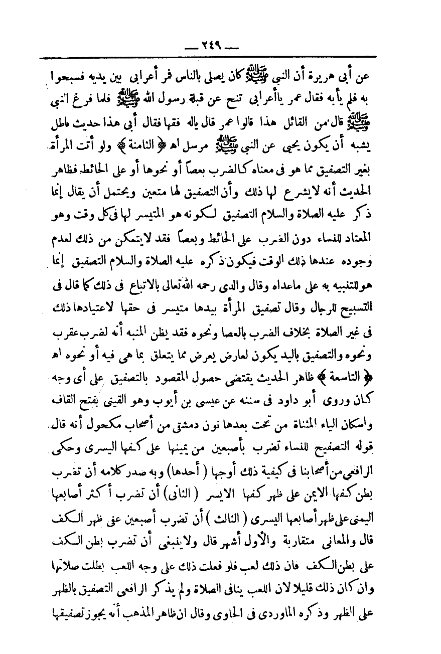 (التَّاسِعَةُ) ظَاهِرُ الْحَدِيثِ يَقْتَضِي حُصُولَ الْمَقْصُودِ بِالتَّصْفِيقِ عَلَى أَيِّ وَجْهٍ كَانَ وَرَوَى أَبُو دَاوُد فِي سُنَنِهِ عَنْ عِيسَى بْنِ أَيُّوبَ وَهُوَ الْقَيْنِيِّ بِفَتْحِ الْقَافِ وَإِسْكَانِ الْيَاءِ الْمُثَنَّاةِ مِنْ تَحْتٍ بَعْدَهَا نُونٌ دِمَشْقِيٌّ مِنْ أَصْحَابِ مَكْحُولٍ أَنَّهُ قَالَ قَوْلُهُ: «التَّصْفِيحُ لِلنِّسَاءِ تَضْرِبُ بِأُصْبُعَيْنِ مِنْ يَمِينِهَا عَلَى كَفِّهَا الْيُسْرَى» وَحَكَى الرَّافِعِيُّ مِنْ أَصْحَابِنَا فِي كَيْفِيَّةِ ذَلِكَ أَوْجُهًا:
