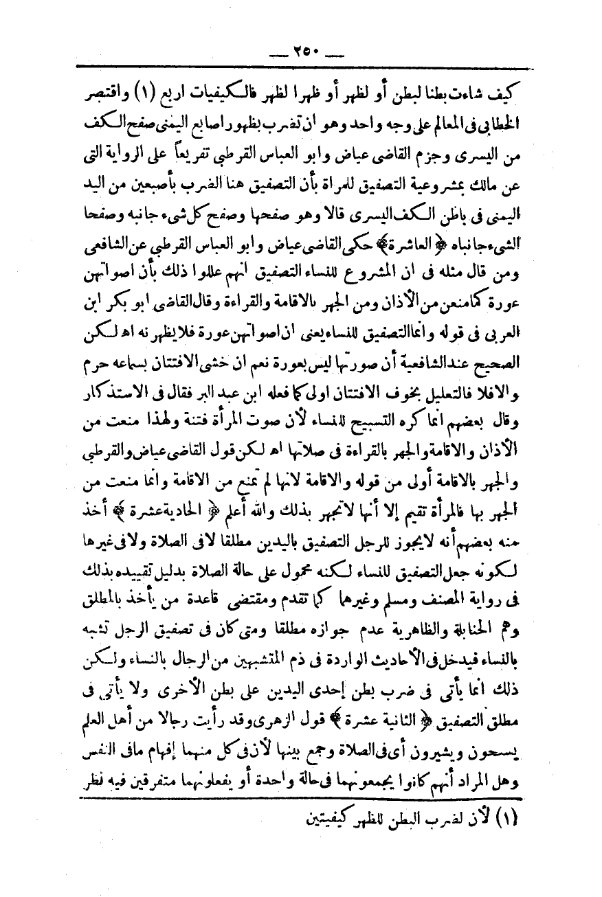 ـــــــــــــــــــــــــــــQكَيْفَ شَاءَتْ بَطْنًا لِبَطْنٍ أَوْ لِظَهْرٍ أَوْ ظَهْرًا لِظَهْرٍ فَالْكَيْفِيَّاتُ أَرْبَعٌ وَاقْتَصَرَ الْخَطَّابِيُّ فِي الْمَعَالِمِ عَلَى وَجْهٍ وَاحِدٍ وَهُوَ أَنْ تَضْرِبَ بِظُهُورِ أَصَابِعِ الْيُمْنَى صَفْحَ الْكَفِّ مِنْ الْيُسْرَى، وَجَزَمَ الْقَاضِي عِيَاضٌ وَأَبُو الْعَبَّاسِ الْقُرْطُبِيُّ تَفْرِيعًا عَلَى الرِّوَايَةِ الَّتِي عَنْ مَالِكٍ بِمَشْرُوعِيَّةِ التَّصْفِيقِ لِلْمَرْأَةِ بِأَنَّ التَّصْفِيقَ هُنَا الضَّرْبُ بِأُصْبُعَيْنِ مِنْ الْيَدِ الْيُمْنَى فِي بَاطِنِ الْكَفِّ الْيُسْرَى قَالَا وَهُوَ صَفْحُهَا وَصَفْحُ كُلِّ شَيْءٍ جَانِبُهُ وَصَفْحَا الشَّيْءِ جَانِبَاهُ.