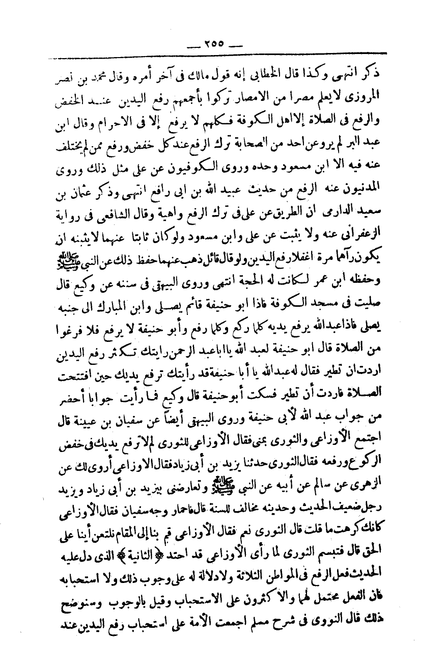 وَكَذَا قَالَ الْخَطَّابِيُّ إنَّهُ قَوْلُ مَالِكٍ فِي آخِرِ أَمْرِهِ وَقَالَ مُحَمَّدُ بْنُ نَصْرٍ الْمَرْوَزِيِّ لَا يَعْلَمُ مِصْرًا مِنْ الْأَمْصَارِ تَرَكُوا بِأَجْمَعِهِمْ رَفْعَ الْيَدَيْنِ عِنْدَ الْخَفْضِ وَالرَّفْعِ فِي الصَّلَاةِ إلَّا أَهْلَ الْكُوفَةِ فَكُلُّهُمْ لَا يَرْفَعُ إلَّا فِي الْإِحْرَامِ وَقَالَ ابْنُ عَبْدِ الْبَرِّ: لَمْ يُرْوَ عَنْ أَحَدٍ مِنْ الصَّحَابَةِ تَرْكُ الرَّفْعِ عِنْدَ كُلِّ خَفْضٍ وَرَفْعٍ مِمَّنْ لَمْ يَخْتَلِفْ عَنْهُ فِيهِ إلَّا ابْنُ مَسْعُودٍ وَحْدُهُ.