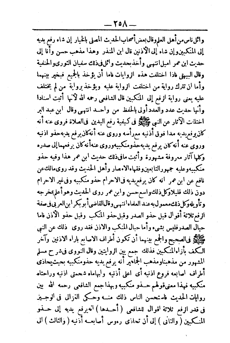 وَقَالَ ابْنُ عَبْدِ الْبَرِّ اخْتَلَفَتْ الْآثَارُ عَنْ النَّبِيِّ - صَلَّى اللَّهُ عَلَيْهِ وَسَلَّمَ - فِي كَيْفِيَّةِ رَفْعِ الْيَدَيْنِ فِي الصَّلَاةِ فَرُوِيَ عَنْهُ أَنَّهُ كَانَ يَرْفَعُ يَدَيْهِ مَا فَوْقَ أُذُنَيْهِ مَعَ رَأْسِهِ وَرُوِيَ عَنْهُ أَنَّهُ كَانَ يَرْفَعُ يَدَيْهِ حَذْوَ أُذُنَيْهِ وَرُوِيَ عَنْهُ أَنَّهُ كَانَ يَرْفَعُ يَدَيْهِ حَذْوَ مَنْكِبَيْهِ وَرُوِيَ عَنْهُ أَنَّهُ كَانَ يَرْفَعُهُمَا إلَى صَدْرِهِ وَكُلُّهَا آثَارٌ مَعْرُوفَةٌ مَشْهُورَةٌ وَأَثْبَتُ مَا فِي ذَلِكَ حَدِيثُ ابْنِ عُمَرَ هَذَا وَفِيهِ «حَذْوَ مَنْكِبَيْهِ» وَعَلَيْهِ جُمْهُورُ التَّابِعِينَ وَفُقَهَاءُ الْأَمْصَارِ وَأَهْلُ الْحَدِيثِ.