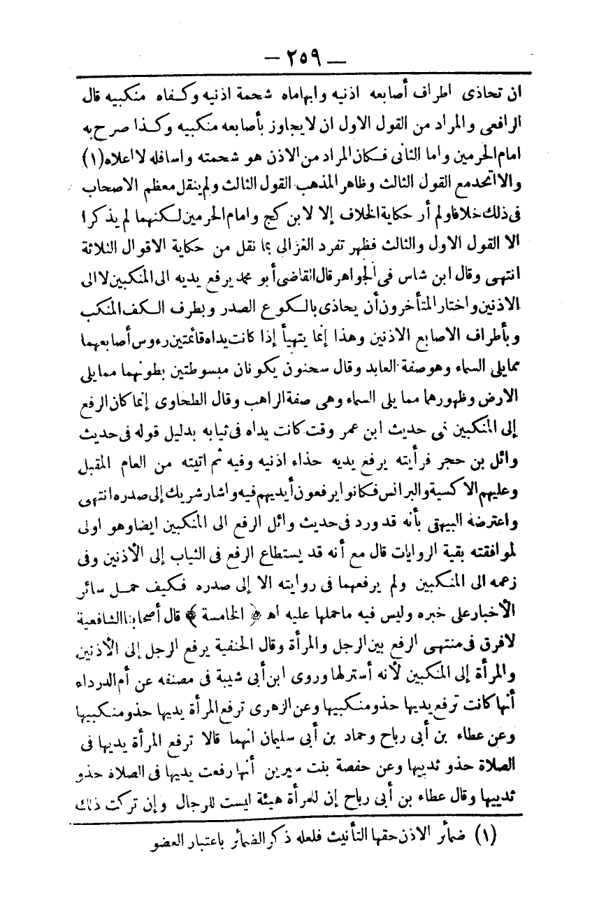 (الْخَامِسَةُ) قَالَ أَصْحَابُنَا الشَّافِعِيَّةُ لَا فَرْقَ فِي مُنْتَهَى الرَّفْعِ بَيْنَ الرَّجُلِ وَالْمَرْأَةِ وَقَالَ الْحَنَفِيَّةُ يَرْفَعُ الرَّجُلُ إلَى الْأُذُنَيْنِ وَالْمَرْأَةُ إلَى الْمَنْكِبَيْنِ؛ لِأَنَّهُ أَسْتَرُ لَهَا وَرَوَى ابْنُ أَبِي شَيْبَةَ فِي مُصَنَّفِهِ عَنْ أُمِّ الدَّرْدَاءِ أَنَّهَا كَانَتْ تَرْفَعُ يَدَيْهَا حَذْوَ مَنْكِبَيْهَا وَعَنْ الزُّهْرِيِّ تَرْفَعُ الْمَرْأَةُ يَدَيْهَا حَذْوَ مَنْكِبَيْهَا وَعَنْ عَطَاءِ بْنِ أَبِي رَبَاحٍ وَحَمَّادِ بْنِ أَبِي سُلَيْمَانَ أَنَّهُمَا قَالَا: تَرْفَعُ الْمَرْأَةُ يَدَيْهَا فِي الصَّلَاةِ حَذْوَ ثَدْيَيْهَا وَعَنْ حَفْصَةَ بِنْتِ سِيرِينَ أَنَّهَا رَفَعَتْ يَدَيْهَا فِي الصَّلَاةِ حَذْوَ ثَدْيَيْهَا وَقَالَ عَطَاءُ بْنُ أَبِي رَبَاحٍ إنَّ لِلْمَرْأَةِ هَيْئَةٌ لَيْسَتْ لِلرِّجَالِ وَإِنْ تَرَكَتْ ذَلِكَ