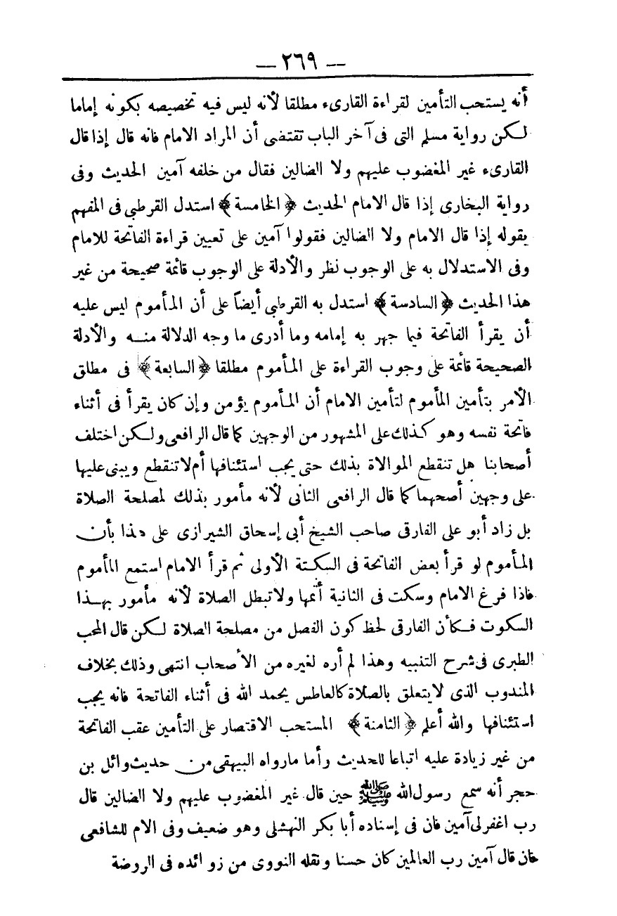 ـــــــــــــــــــــــــــــQأَنَّهُ يُسْتَحَبُّ التَّأْمِينُ لِقِرَاءَةِ الْقَارِئِ مُطْلَقًا؛ لِأَنَّهُ لَيْسَ فِيهِ تَخْصِيصُهُ بِكَوْنِهِ إمَامًا لَكِنَّ رِوَايَةَ مُسْلِمٍ الَّتِي فِي آخَرِ الْبَابِ تَقْتَضِي أَنَّ الْمُرَادَ الْإِمَامُ فَإِنَّهُ قَالَ «إذَا قَالَ الْقَارِئُ {غَيْرِ الْمَغْضُوبِ عَلَيْهِمْ وَلا الضَّالِّينَ} [الفاتحة: 7] فَقَالَ مَنْ خَلْفَهُ آمِينَ» الْحَدِيثَ وَفِي رِوَايَةِ الْبُخَارِيِّ «إذَا قَالَ الْإِمَامُ» الْحَدِيثَ.