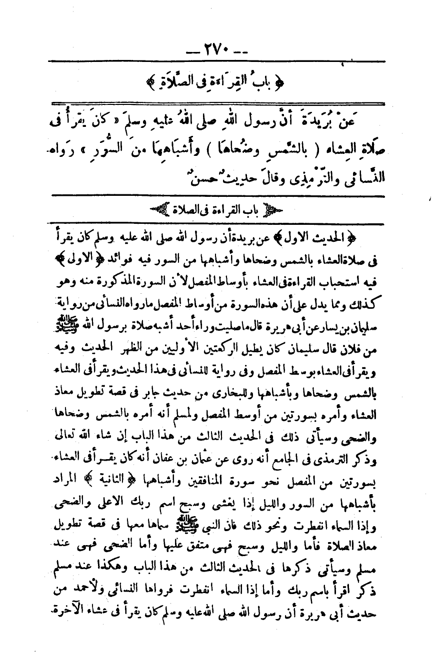 بَابُ الْقِرَاءَةِ فِي الصَّلَاةِ عَنْ بُرَيْدَةَ أَنَّ «رَسُولَ اللَّهِ - صَلَّى اللَّهُ عَلَيْهِ وَسَلَّمَ - كَانَ يَقْرَأُ فِي صَلَاةِ الْعِشَاءِ بِالشَّمْسِ وَضُحَاهَا وَأَشْبَاهِهَا مِنْ السُّوَرِ» رَوَاهُ النَّسَائِيّ وَالتِّرْمِذِيُّ وَقَالَ حَدِيثٌ حَسَنٌ. .