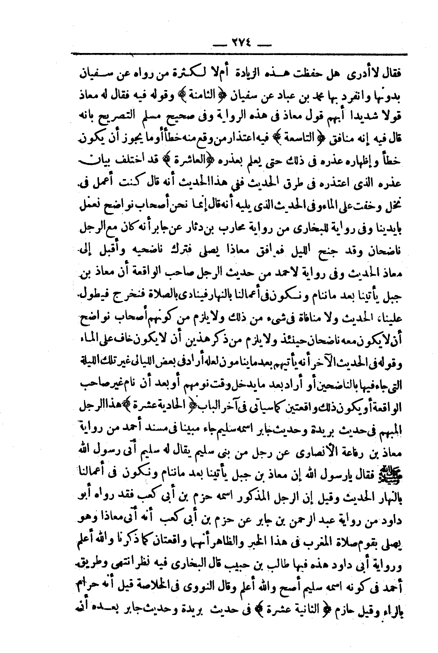 (الْحَادِيَةَ عَشَرَ) هَذَا الرَّجُلُ الْمُبْهَمُ فِي حَدِيثِ بُرَيْدَةَ وَحَدِيثِ جَابِرٍ اسْمُهُ سُلَيْمٌ جَاءَ مُبَيَّنًا فِي مُسْنَدِ أَحْمَدَ مِنْ رِوَايَةِ مُعَاذِ بْنِ رِفَاعَةَ الْأَنْصَارِيِّ عَنْ «رَجُلٍ مِنْ بَنِي سُلَيْمٍ يُقَالُ لَهُ: سُلَيْمٌ أَتَى رَسُولَ اللَّهِ - صَلَّى اللَّهُ عَلَيْهِ وَسَلَّمَ - فَقَالَ يَا رَسُولَ اللَّهِ إنَّ مُعَاذَ بْنَ جَبَلٍ يَأْتِينَا بَعْدَ مَا نَنَامُ وَنَكُونُ فِي أَعْمَالِنَا بِالنَّهَارِ» الْحَدِيثَ.