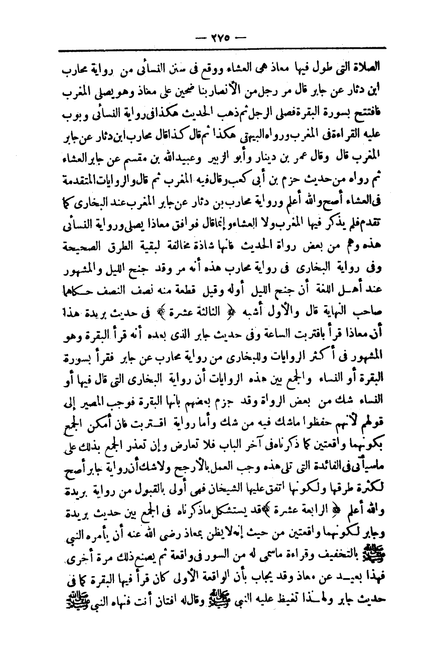 وَرِوَايَةُ مُحَارِبِ بْنِ دِثَارٍ عَنْ جَابِرٍ «الْمَغْرِبُ» عِنْدَ الْبُخَارِيِّ كَمَا تَقَدَّمَ فَلَمْ يَذْكُرْ فِيهَا الْمَغْرِبَ وَلَا الْعِشَاءَ وَإِنَّمَا قَالَ «فَوَافَقَ مُعَاذًا يُصَلِّي» وَرِوَايَةُ النَّسَائِيّ هَذِهِ وَهْمٌ مِنْ بَعْضِ رُوَاةِ الْحَدِيثِ فَإِنَّهَا شَاذَّةٌ مُخَالِفَةٌ لِبَقِيَّةِ الطُّرُقِ الصَّحِيحَةِ وَفِي رِوَايَةِ الْبُخَارِيِّ فِي رِوَايَةِ مُحَارِبٍ هَذِهِ «أَنَّهُ مَرَّ، وَقَدْ جَنَحَ اللَّيْلُ» وَالْمَشْهُورُ عِنْدَ أَهْلِ اللُّغَةِ أَنَّ جُنْحَ اللَّيْلِ أَوَّلُهُ وَقِيلَ: قِطْعَةٌ مِنْهُ نِصْفُ النِّصْفِ حَكَاهُمَا صَاحِبُ النِّهَايَةِ قَالَ وَالْأَوَّلُ أَشْبَهُ.