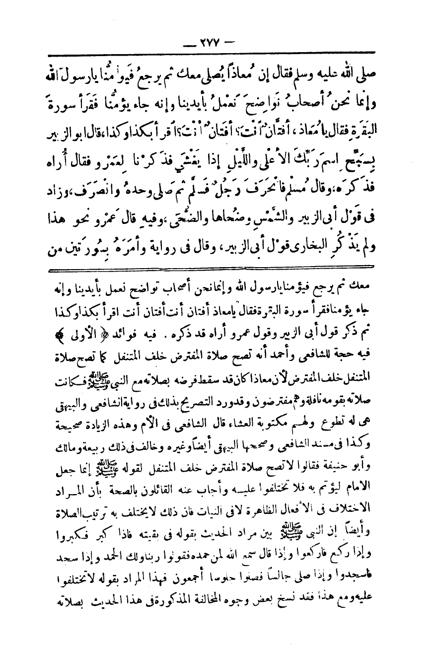 - صَلَّى اللَّهُ عَلَيْهِ وَسَلَّمَ - فَقَالَ إنَّ مُعَاذًا يُصَلِّي مَعَك ثُمَّ يَرْجِعُ فَيَؤُمُّنَا يَا رَسُولَ اللَّهِ وَإِنَّمَا نَحْنُ أَصْحَابُ نَوَاضِحَ نَعْمَلُ بِأَيْدِينَا وَإِنَّهُ جَاءَ يَؤُمُّنَا فَقَرَأَ سُورَةَ الْبَقَرَةِ فَقَالَ يَا مُعَاذُ، أَفَتَّانٌ أَنْتَ؟ أَفَتَّانٌ أَنْتَ؟ اقْرَأْ بِكَذَا، وَكَذَا، قَالَ أَبُو الزُّبَيْرِ بِسَبِّحْ اسْمَ رَبِّك الْأَعْلَى وَاللَّيْلِ إذَا يَغْشَى فَذَكَرْنَا لِعَمْرٍو فَقَالَ أَرَاهُ فَذَكَرَهُ» .