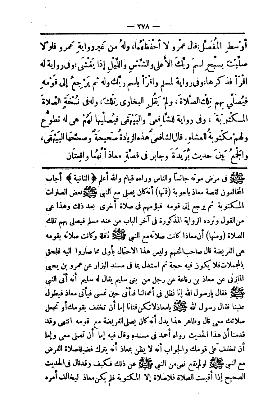 أَوْسَطِ الْمُفَصَّلِ قَالَ عَمْرٌو وَلَا أَحْفَظُهُمَا» ، وَلَهُ مِنْ غَيْرِ رِوَايَةِ عَمْرٍو «فَلَوْلَا صَلَّيْت بِسَبِّحْ اسْمَ رَبِّك الْأَعْلَى وَالشَّمْسِ وَاللَّيْلِ إذَا يَغْشَى» ، وَفِي رِوَايَةٍ لَهُ «اقْرَأْ» فَذَكَرَهَا، وَفِي رِوَايَةٍ لِمُسْلِمٍ «وَاقْرَأْ بِاسْمِ رَبِّك وَلَهُ ثُمَّ يَرْجِعُ إلَى قَوْمِهِ فَيُصَلِّي بِهِمْ تِلْكَ الصَّلَاةَ» وَلَمْ يَقُلْ الْبُخَارِيُّ «تِلْكَ» ، وَلَهُ فِي نُسْخَةٍ «الصَّلَاةَ الْمَكْتُوبَةَ» ، وَفِي رِوَايَةٍ لِلشَّافِعِيِّ وَالْبَيْهَقِيِّ «فَيُصَلِّيهَا لَهُمْ هِيَ لَهُ تَطَوُّعٌ وَلَهُمْ مَكْتُوبَةٌ الْعِشَاءَ» . قَالَ الشَّافِعِيُّ هَذِهِ الزِّيَادَةُ صَحِيحَةٌ وَصَحَّحَهَا الْبَيْهَقِيُّ، وَالْجَمْعُ بَيْنَ حَدِيثِ بُرَيْدَةَ وَجَابِرٍ فِي قِصَّةِ مُعَاذٍ أَنَّهُمَا وَاقِعَتَانِ. ..