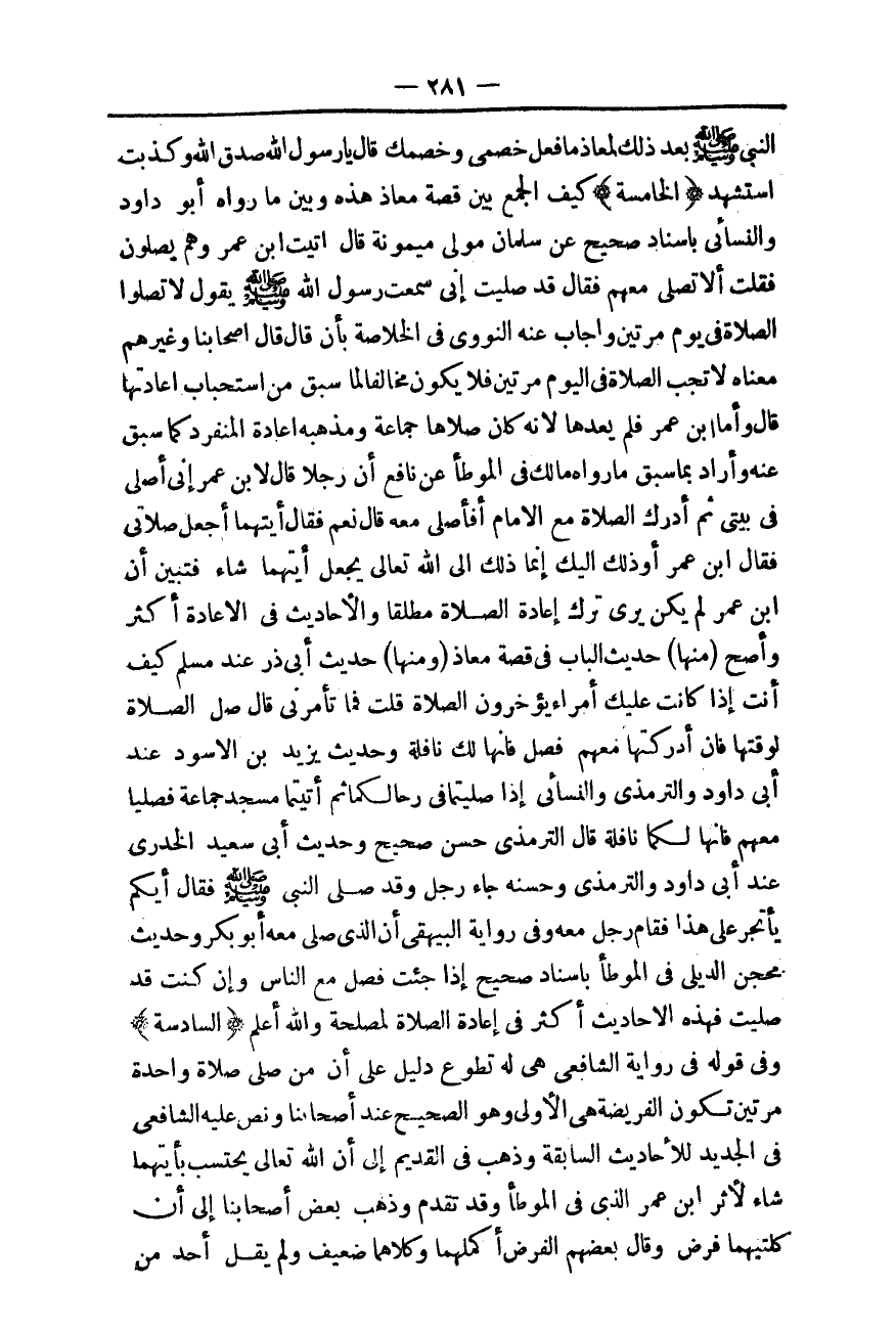 (الْخَامِسَةُ) كَيْفَ الْجَمْعُ بَيْنَ قِصَّةِ مُعَاذٍ هَذِهِ وَبَيْنَ مَا رَوَاهُ أَبُو دَاوُد وَالنَّسَائِيُّ بِإِسْنَادٍ صَحِيحٍ عَنْ سَلْمَانَ مَوْلَى مَيْمُونَةَ قَالَ أَتَيْت ابْنَ عُمَرَ وَهُمْ يُصَلُّونَ فَقُلْت أَلَا تُصَلِّي مَعَهُمْ فَقَالَ قَدْ صَلَّيْت إنِّي سَمِعْت رَسُولَ اللَّهِ - صَلَّى اللَّهُ عَلَيْهِ وَسَلَّمَ - يَقُولُ «لَا تُصَلُّوا الصَّلَاةَ فِي يَوْمٍ مَرَّتَيْنِ؟»
