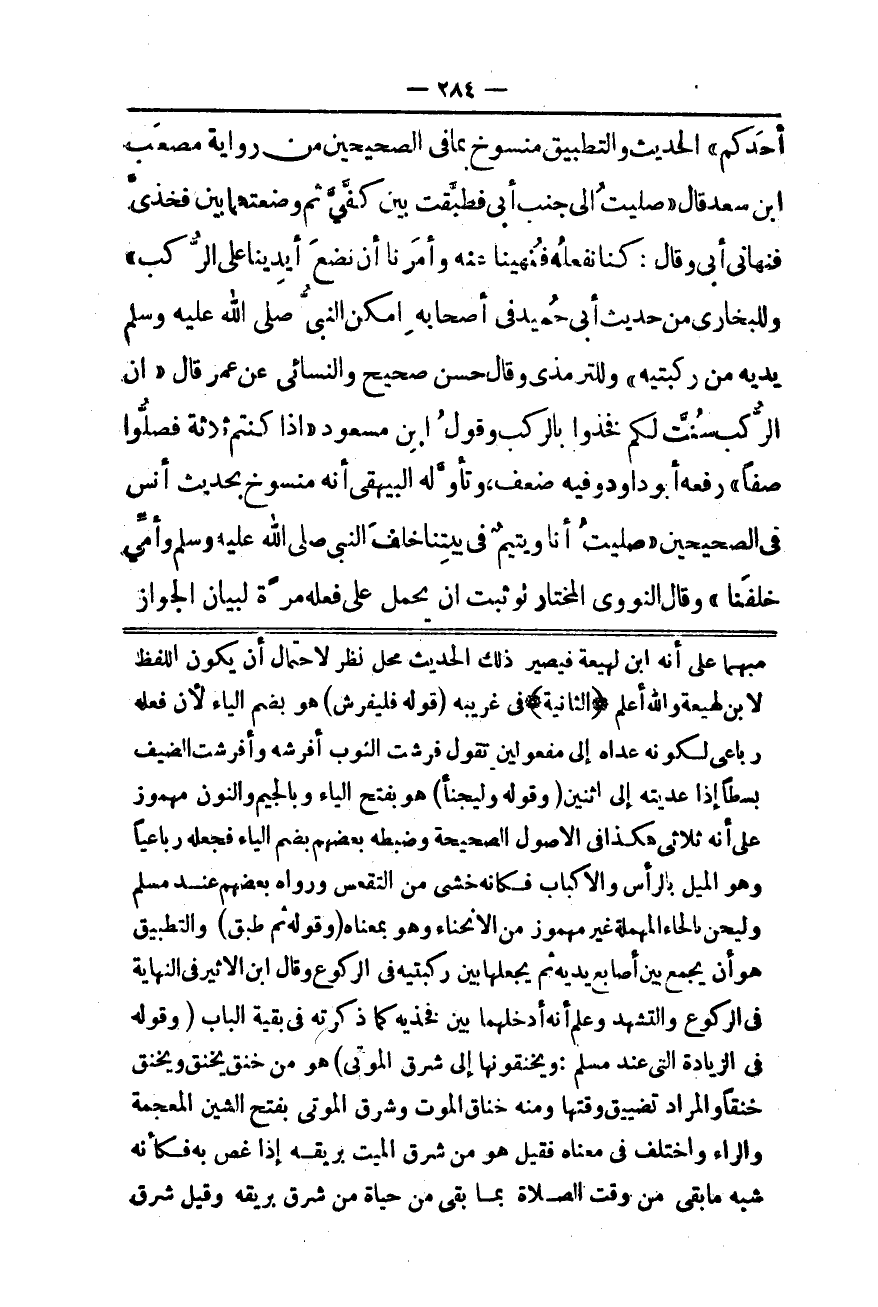 أَحَدُكُمْ " الْحَدِيثَ. وَالتَّطْبِيقُ مَنْسُوخٌ بِمَا فِي الصَّحِيحَيْنِ مِنْ رِوَايَةِ مُصْعَبِ بْنِ سَعْدٍ قَالَ «صَلَّيْت إلَى جَنْبِ أَبِي فَطَبَّقْت بَيْنَ كَفَّيَّ، ثُمَّ وَضَعَتْهُمَا بَيْنَ فَخِذَيَّ فَنَهَانِي أَبِي قَالَ: كُنَّا نَفْعَلُهُ فَنُهِينَا عَنْهُ وَأُمِرْنَا أَنْ نَضَعَ أَيْدِيَنَا عَلَى الرُّكَبِ» .