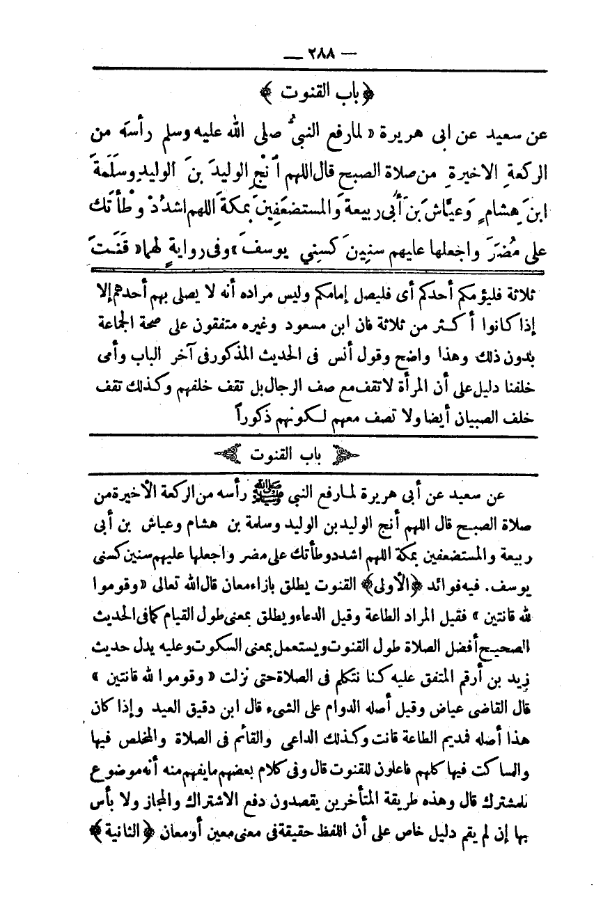بَابُ الْقُنُوتِ عَنْ سَعِيدٍ عَنْ أَبِي هُرَيْرَةَ «لَمَّا رَفَعَ النَّبِيُّ - صَلَّى اللَّهُ عَلَيْهِ وَسَلَّمَ - رَأْسَهُ مِنْ الرَّكْعَةِ الْأَخِيرَةِ مِنْ صَلَاةِ الصُّبْحِ قَالَ اللَّهُمَّ أَنْجِ الْوَلِيدَ بْنَ الْوَلِيدِ وَسَلَمَةَ بْنَ هِشَامٍ وَعَيَّاشَ بْنَ أَبِي رَبِيعَةَ وَالْمُسْتَضْعَفِينَ بِمَكَّةَ اللَّهُمَّ اُشْدُدْ وَطْأَتَك عَلَى مُضَرَ وَاجْعَلْهَا سِنِينَ كَسِنِي يُوسُفَ» وَفِي رِوَايَةٍ لَهُمَا «قَنَتَ