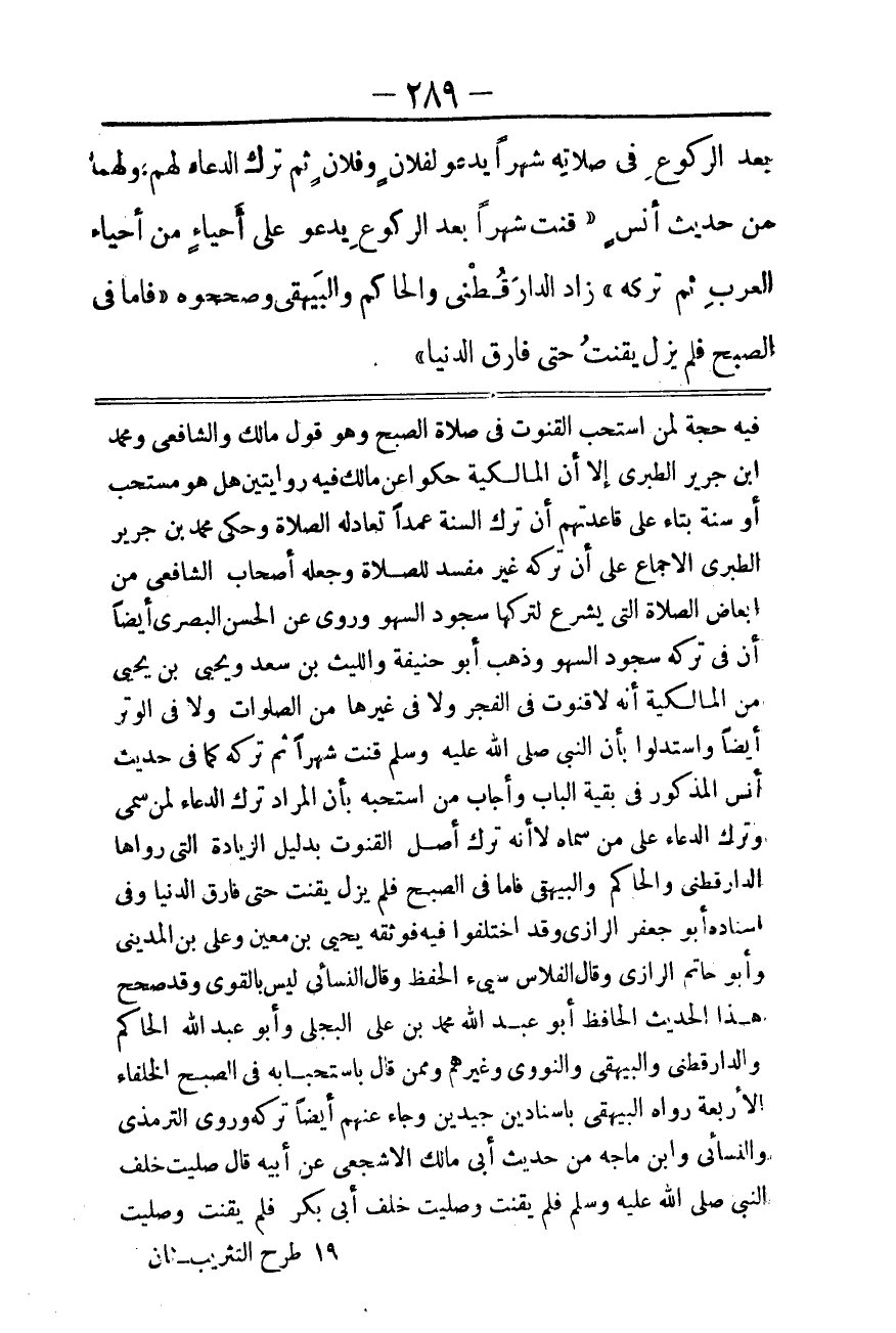 بَعْدِ الرُّكُوعِ فِي صَلَاتِهِ شَهْرًا يَدْعُو لِفُلَانٍ وَفُلَانٍ، ثُمَّ تَرَكَ الدُّعَاءَ لَهُمْ» ، وَلَهُمَا مِنْ حَدِيثِ أَنَسٍ «قَنَتَ شَهْرًا بَعْدَ الرُّكُوعِ يَدْعُو عَلَى أَحْيَاءٍ مِنْ أَحْيَاءِ الْعَرَبِ، ثُمَّ تَرَكَهُ» زَادَ الدَّارَقُطْنِيُّ وَالْحَاكِمُ وَالْبَيْهَقِيُّ وَصَحَّحُوهُ «فَأَمَّا فِي الصُّبْحِ فَلَمْ يَزَلْ يَقْنُتُ حَتَّى فَارَقَ الدُّنْيَا» ..