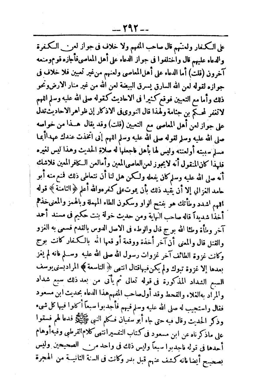 ـــــــــــــــــــــــــــــQعَلَى الْكُفَّارِ وَلَعْنَتِهِمْ قَالَ صَاحِبُ الْمُفْهِمِ وَلَا خِلَافَ فِي جَوَازِ لَعْنِ الْكَفَرَةِ وَالدُّعَاءِ عَلَيْهِمْ قَالَ وَاخْتَلَفُوا فِي جَوَازِ الدُّعَاءِ عَلَى أَهْلِ الْمَعَاصِي فَأَجَازَهُ قَوْمٌ وَمَنَعَهُ آخَرُونَ.