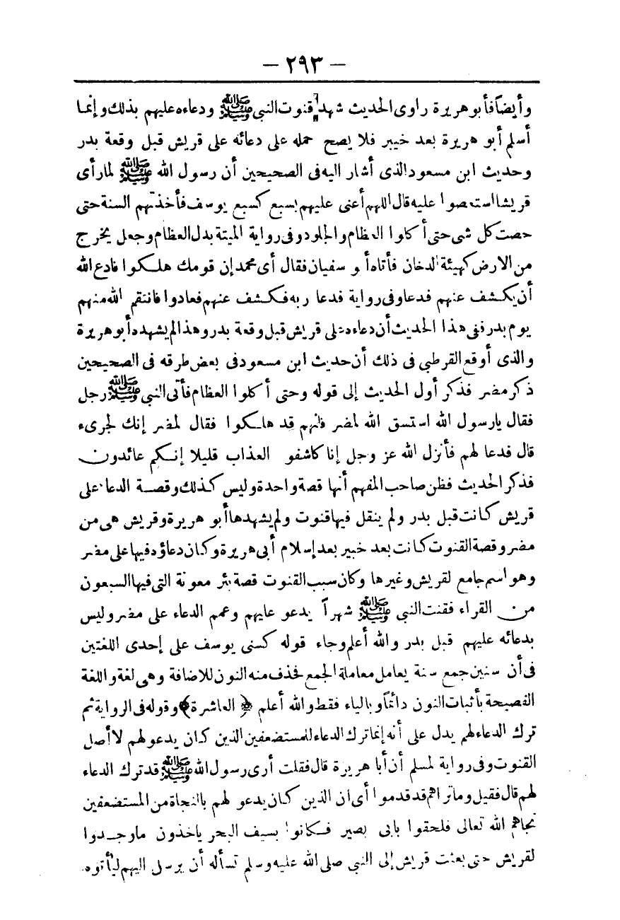 ـــــــــــــــــــــــــــــQوَأَيْضًا فَأَبُو هُرَيْرَةَ رَاوِي الْحَدِيثِ شَهِدَ قُنُوتَ النَّبِيِّ - صَلَّى اللَّهُ عَلَيْهِ وَسَلَّمَ - وَدُعَاءَهُ عَلَيْهِمْ بِذَلِكَ وَإِنَّمَا أَسْلَمَ أَبُو هُرَيْرَةَ بَعْدَ خَيْبَرَ فَلَا يَصِحُّ حَمْلُهُ عَلَى دُعَائِهِ عَلَى قُرَيْشٍ قَبْلَ وَقْعَةِ بَدْرٍ.