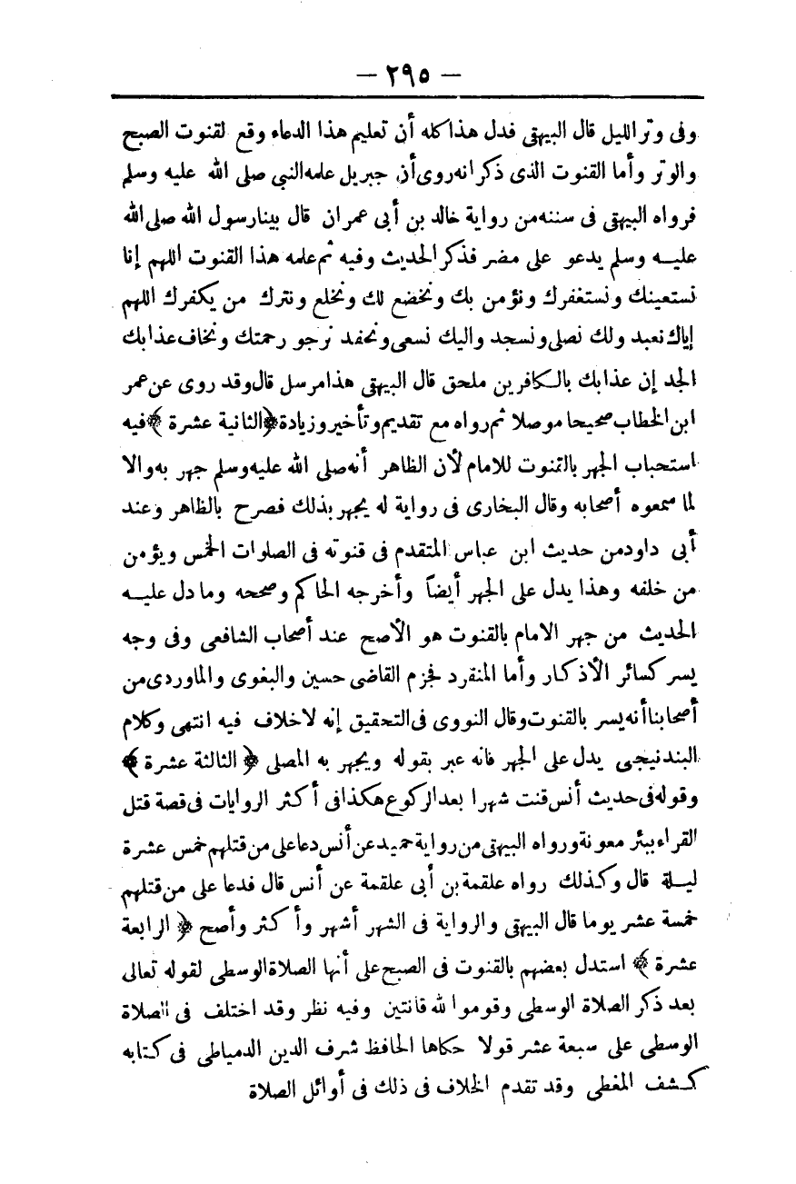 ـــــــــــــــــــــــــــــQوَفِي وِتْرِ اللَّيْلِ» قَالَ الْبَيْهَقِيُّ فَدَلَّ هَذَا كُلُّهُ أَنَّ تَعْلِيمَ هَذَا الدُّعَاءِ وَقَعَ لِقُنُوتِ الصُّبْحِ وَالْوِتْرِ وَأَمَّا الْقُنُوتُ الَّذِي ذُكِرَ أَنَّهُ رُوِيَ أَنَّ جِبْرِيلَ عَلَّمَهُ النَّبِيَّ - صَلَّى اللَّهُ عَلَيْهِ وَسَلَّمَ - فَرَوَاهُ الْبَيْهَقِيُّ فِي سُنَنِهِ مِنْ رِوَايَةِ خَالِدِ بْنِ أَبِي عِمْرَانَ قَالَ «بَيْنَا رَسُولُ اللَّهِ - صَلَّى اللَّهُ عَلَيْهِ وَسَلَّمَ - يَدْعُو عَلَى مُضَرَ» فَذَكَرَ الْحَدِيثَ وَفِيهِ «، ثُمَّ عَلَّمَهُ هَذَا الْقُنُوتَ اللَّهُمَّ إنَّا نَسْتَعِينُك وَنَسْتَغْفِرُك وَنُؤْمِنُ بِك وَنَخْضَعُ لَك وَنَخْلَعُ وَنَتْرُكُ مَنْ يَكْفُرُك اللَّهُمَّ إيَّاكَ نَعْبُدُ وَلَك نُصَلِّي وَنَسْجُدُ وَإِلَيْك نَسْعَى وَنَحْفِدُ نَرْجُو رَحْمَتَك وَنَخَافُ عَذَابَك الْجِدَّ إنَّ عَذَابَك بِالْكَافِرِينَ مُلْحَقٌ» قَالَ الْبَيْهَقِيُّ هَذَا مُرْسَلٌ قَالَ وَقَدْ رُوِيَ عَنْ عُمَرَ بْنِ الْخَطَّابِ صَحِيحًا مُوصَلًا، ثُمَّ رَوَاهُ مَعَ تَقْدِيمٍ وَتَأْخِيرٍ وَزِيَادَةٍ.