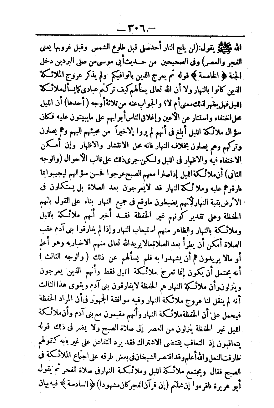 (الْخَامِسَةُ) قَوْلُهُ «ثُمَّ يَعْرُجُ الَّذِينَ بَاتُوا فِيكُمْ» وَلَمْ يَذْكُرْ عُرُوجَ الْمَلَائِكَةِ الَّذِينَ كَانُوا بِالنَّهَارِ وَلَا أَنَّ اللَّهَ تَعَالَى يَسْأَلُهُمْ كَيْفَ تَرَكْتُمْ عِبَادِي كَمَا يَسْأَلُ مَلَائِكَةَ اللَّيْلِ فَهَلْ يَظْهَرُ لِذَلِكَ مَعْنًى أَمْ لَا؟ وَالْجَوَابُ عَنْهُ مِنْ ثَلَاثَةِ أَوْجُهٍ: