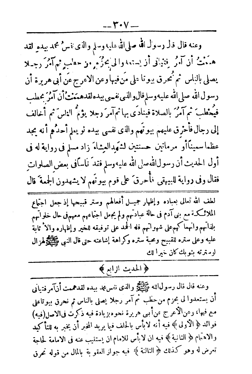 (الْحَدِيثُ الرَّابِعُ) وَعَنْهُ قَالَ قَالَ رَسُولُ اللَّهِ - صَلَّى اللَّهُ عَلَيْهِ وَسَلَّمَ - «وَاَلَّذِي نَفْسُ مُحَمَّدٍ بِيَدِهِ لَقَدْ هَمَمْت أَنْ آمُرَ فِتْيَانِي أَنْ يَسْتَعِدُّوا لِي بِحُزَمٍ مِنْ حَطَبٍ، ثُمَّ آمُرَ رَجُلًا يُصَلِّيَ بِالنَّاسِ، ثُمَّ نُحَرِّقَ بُيُوتًا عَلَى مَنْ فِيهَا» ، وَعَنْ الْأَعْرَجِ عَنْ أَبِي هُرَيْرَةَ نَحْوَهُ بِزِيَادَةٍ فِيهِ ذُكِرَتْ فِي الْأَصْلِ (فِيهِ) فَوَائِدُ: