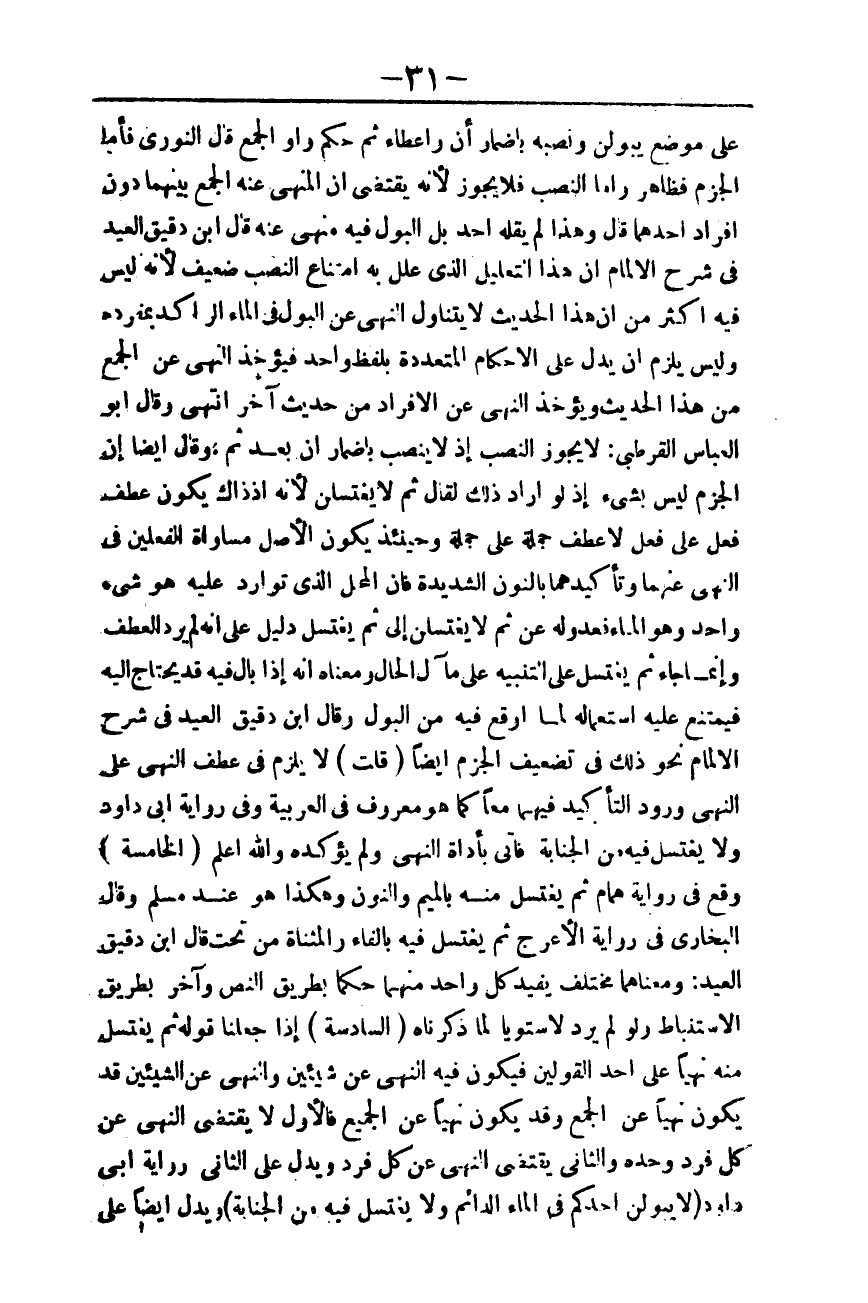 قَالَ: وَهَذَا لَمْ يَقُلْهُ أَحَدٌ بَلْ الْبَوْلُ فِيهِ مَنْهِيٌّ عَنْهُ قَالَ ابْنُ دَقِيقِ الْعِيدِ فِي شَرْحِ الْإِلْمَامِ: إنَّ هَذَا التَّعْلِيلَ الَّذِي عَلَّلَ بِهِ امْتِنَاعَ النَّصْبِ ضَعِيفٌ؛ لِأَنَّهُ لَيْسَ فِيهِ أَكْثَرُ مِنْ أَنَّ هَذَا الْحَدِيثَ لَا يَتَنَاوَلُ النَّهْيَ عَنْ الْبَوْلِ فِي الْمَاءِ الرَّاكِدِ بِمُفْرَدِهِ وَلَيْسَ يَلْزَمُ أَنْ يَدُلَّ عَلَى الْأَحْكَامِ الْمُتَعَدِّدَةِ بِلَفْظٍ وَاحِدٍ فَيُؤْخَذُ النَّهْيُ عَنْ الْجَمْعِ مِنْ هَذَا الْحَدِيثِ وَيُؤْخَذُ النَّهْيُ عَنْ الْإِفْرَادِ مِنْ حَدِيثٍ آخَرَ انْتَهَى وَقَالَ أَبُو الْعَبَّاسِ الْقُرْطُبِيُّ: لَا يَجُوزُ النَّصْبُ إذْ لَا يُنْصَبُ بِإِضْمَارِ أَنْ بَعْدَ ثُمَّ، وَقَالَ أَيْضًا: إنَّ الْجَزْمَ لَيْسَ بِشَيْءٍ إذْ لَوْ أَرَادَ ذَلِكَ لَقَالَ: ثُمَّ لَا يَغْتَسِلْنَ؛ لِأَنَّهُ إذْ ذَاكَ يَكُونُ عَطْفَ فِعْلٍ عَلَى فِعْلٍ لَا عَطْفَ جُمْلَةٍ عَلَى جُمْلَةٍ.