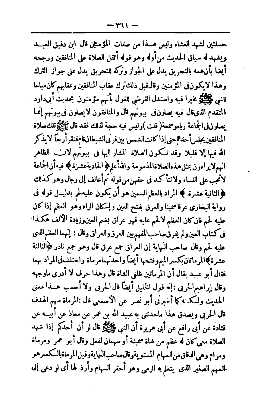 ـــــــــــــــــــــــــــــQحَسَنَتَيْنِ لَشَهِدَ الْعِشَاءَ وَلَيْسَ هَذَا مِنْ صِفَاتِ الْمُؤْمِنِينَ قَالَ ابْنُ دَقِيقِ الْعِيدِ وَيَشْهَدُ لَهُ سِيَاقُ الْحَدِيثِ مِنْ أَوَّلِهِ وَهُوَ قَوْلُهُ «أَثْقَلُ الصَّلَاةِ عَلَى الْمُنَافِقِينَ» وَرَجَّحَهُ أَيْضًا بِأَنَّ هَمَّهُ بِالتَّحْرِيقِ يَدُلُّ عَلَى الْجَوَازِ وَتَرْكَهُ لِلتَّحْرِيقِ يَدُلُّ عَلَى جَوَازِ التَّرْكِ وَهَذَا لَا يَكُونُ فِي الْمُؤْمِنِينَ وَقَالَ قَبْلَ ذَلِكَ تَرَكَ عِقَابَ الْمُنَافِقِينَ، وَعِقَابُهُمْ كَانَ مُبَاحًا لِلنَّبِيِّ - صَلَّى اللَّهُ عَلَيْهِ وَسَلَّمَ - مُخَيَّرًا فِيهِ وَاسْتَدَلَّ الْقُرْطُبِيُّ لِلْقَوْلِ بِأَنَّهُمْ مُؤْمِنُونَ بِحَدِيثِ أَبِي دَاوُد الْمُتَقَدِّمِ الَّذِي قَالَ فِيهِ «يُصَلُّونَ فِي بُيُوتِهِمْ» قَالَ وَالْمُنَافِقُونَ لَا يُصَلُّونَ فِي بُيُوتِهِمْ إنَّمَا يُصَلُّونَ فِي الْجَمَاعَةِ رِيَاءً وَسُمْعَةً.