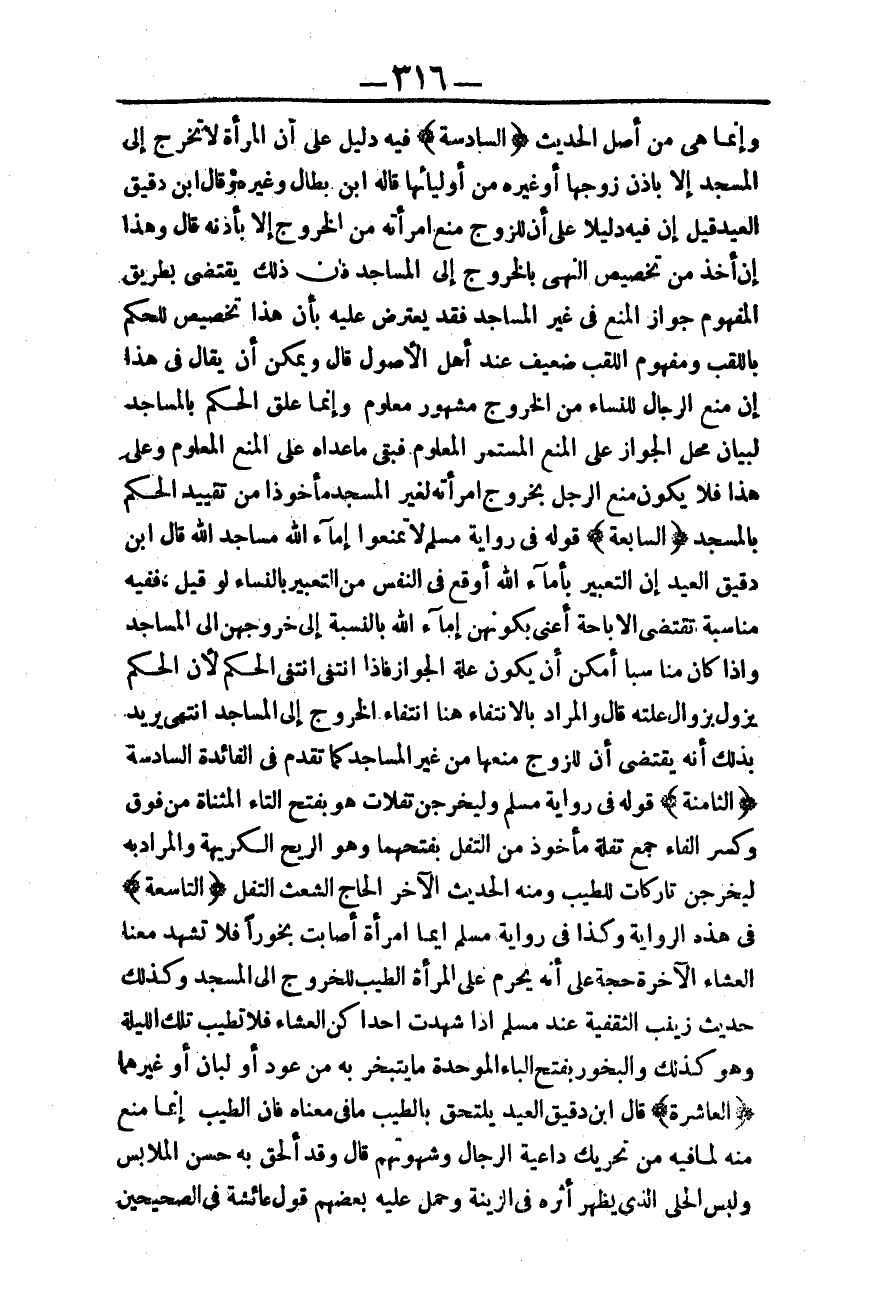 (السَّادِسَةُ) فِيهِ دَلِيلٌ عَلَى أَنَّ الْمَرْأَةَ لَا تَخْرُجُ إلَى الْمَسْجِدِ إلَّا بِإِذْنِ زَوْجِهَا أَوْ غَيْرِهِ مِنْ أَوْلِيَائِهَا قَالَهُ ابْنُ بَطَّالٍ وَغَيْرُهُ وَقَالَ ابْنُ دَقِيقِ الْعِيدِ قِيلَ: إنَّ فِيهِ دَلِيلًا عَلَى أَنَّ لِلزَّوْجِ مَنْعُ امْرَأَتِهِ مِنْ الْخُرُوجِ إلَّا بِإِذْنِهِ قَالَ وَهَذَا إنْ أُخِذَ مِنْ تَخْصِيصِ النَّهْيِ بِالْخُرُوجِ إلَى الْمَسَاجِدِ فَإِنَّ ذَلِكَ يَقْتَضِي بِطَرِيقِ الْمَفْهُومِ جَوَازَ الْمَنْعِ فِي غَيْرِ الْمَسَاجِدِ فَقَدْ يُعْتَرَضُ عَلَيْهِ بِأَنَّ هَذَا تَخْصِيصٌ لِلْحُكْمِ بِاللَّقَبِ وَمَفْهُومُ اللَّقَبِ ضَعِيفٌ عِنْدَ أَهْلِ الْأُصُولِ قَالَ وَيُمْكِنُ أَنْ يُقَالَ فِي هَذَا إنَّ مَنْعَ الرِّجَالِ لِلنِّسَاءِ مِنْ الْخُرُوجِ مَشْهُورٌ مَعْلُومٌ وَإِنَّمَا عُلِّقَ الْحُكْمُ بِالْمَسَاجِدِ لِبَيَانِ مَحَلِّ الْجَوَازِ عَلَى الْمَنْعِ الْمُسْتَمِرِّ الْمَعْلُومِ فَبَقِيَ مَا عَدَاهُ عَلَى الْمَنْعِ الْمَعْلُومِ وَعَلَى هَذَا فَلَا يَكُونُ مَنْعُ الرَّجُلِ بِخُرُوجِ امْرَأَتِهِ لِغَيْرِ الْمَسْجِدِ مَأْخُوذًا مِنْ تَقْيِيدِ الْحُكْمِ بِالْمَسْجِدِ.