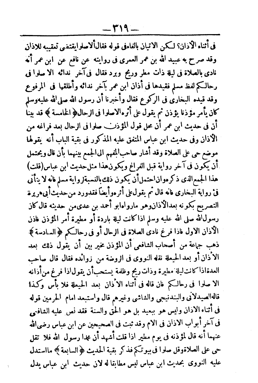 ـــــــــــــــــــــــــــــQأَمْ فِي أَثْنَاءِ الْأَذَانِ؟ لَكِنَّ الْإِتْيَانَ بِالْفَاءِ فِي قَوْلِهِ «فَقَالَ أَلَا صَلُّوا» يَقْتَضِي تَعْقِيبَهُ لِلْأَذَانِ وَقَدْ صَرَّحَ بِهِ عُبَيْدُ اللَّهِ بْنُ عُمَرَ الْعُمَرِيُّ فِي رِوَايَتِهِ عَنْ نَافِعٍ عَنْ ابْنِ عُمَرَ أَنَّهُ نَادَى بِالصَّلَاةِ فِي لَيْلَةٍ ذَاتِ مَطَرٍ وَرِيحٍ وَبَرْدٍ فَقَالَ فِي آخَرِ نِدَائِهِ: أَلَا صَلُّوا فِي رِحَالِكُمْ لَفْظُ مُسْلِمٍ فَقَيَّدَهَا فِي أَذَانِ ابْنِ عُمَرَ بِآخِرِ نِدَائِهِ وَأَطْلَقَهَا فِي الْمَرْفُوعِ.