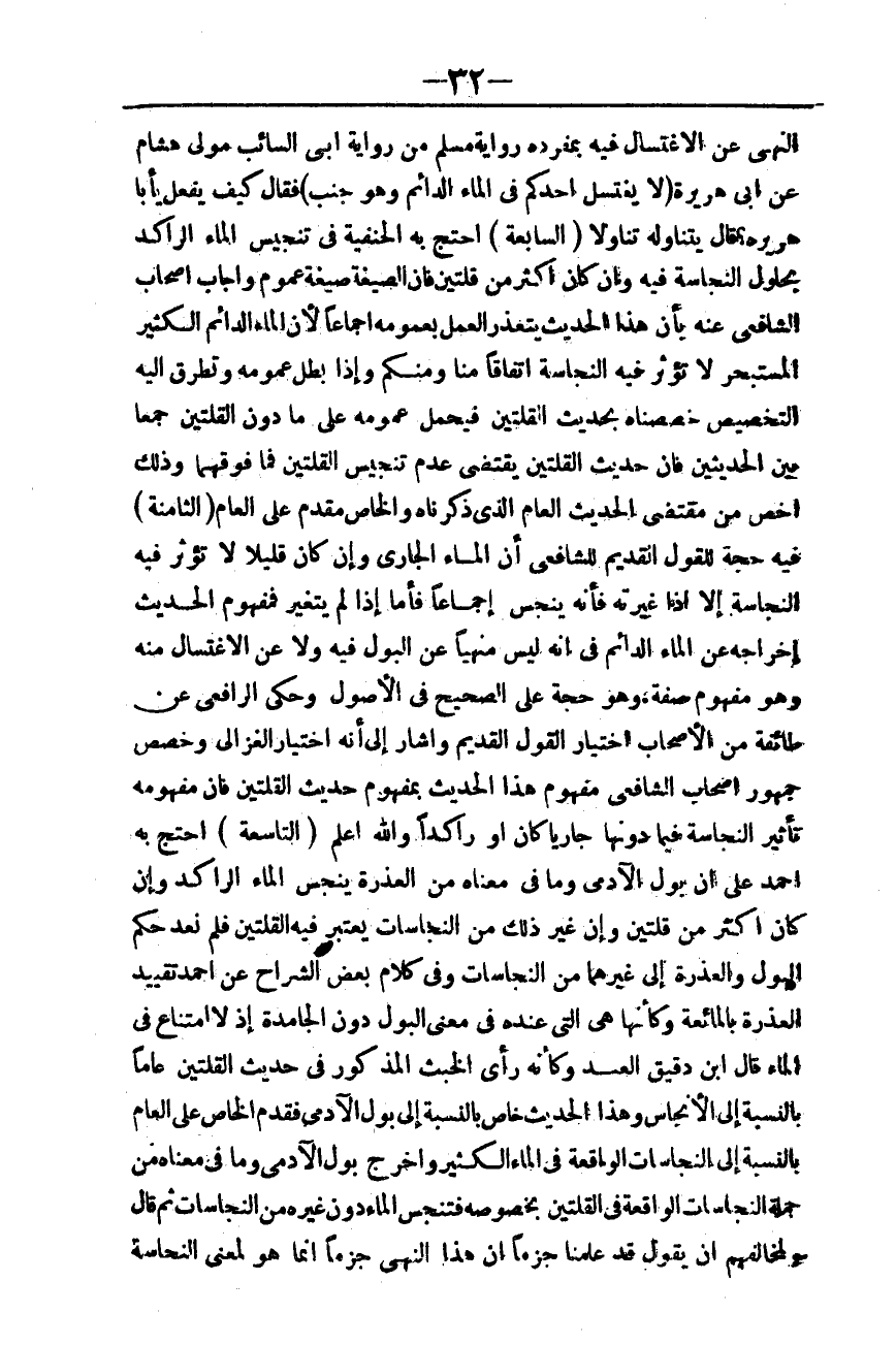 (السَّابِعَةُ) احْتَجَّ بِهِ الْحَنَفِيَّةُ فِي تَنْجِيسِ الْمَاءِ الرَّاكِدِ بِحُلُولِ النَّجَاسَةِ فِيهِ، وَإِنْ كَانَ أَكْثَرَ مِنْ قُلَّتَيْنِ، فَإِنَّ الصِّيغَةَ صِيغَةُ عُمُومٍ وَأَجَابَ أَصْحَابُ الشَّافِعِيِّ عَنْهُ بِأَنَّ هَذَا الْحَدِيثَ يَتَعَذَّرُ الْعَمَلُ بِعُمُومِهِ إجْمَاعًا؛ لِأَنَّ الْمَاءَ الدَّائِمَ الْكَثِيرَ الْمُسْتَبْحِرَ لَا تُؤَثِّرُ فِيهِ النَّجَاسَةُ اتِّفَاقًا مِنَّا وَمِنْكُمْ، وَإِذَا بَطَلَ عُمُومُهُ وَتَطَرَّقَ إلَيْهِ التَّخْصِيصُ خَصَّصْنَاهُ بِحَدِيثِ الْقُلَّتَيْنِ فَيُحْمَلُ عُمُومُهُ عَلَى مَا دُونَ الْقُلَّتَيْنِ جَمْعًا بَيْنَ الْحَدِيثَيْنِ، فَإِنَّ حَدِيثَ الْقُلَّتَيْنِ يَقْتَضِي عَدَمَ تَنْجِيسِ الْقُلَّتَيْنِ فَمَا فَوْقَهُمَا، وَذَلِكَ أَخَصُّ مِنْ مُقْتَضَى الْحَدِيثِ الْعَامِّ الَّذِي ذَكَرْنَاهُ، وَالْخَاصُّ مُقَدَّمٌ عَلَى الْعَامِّ.