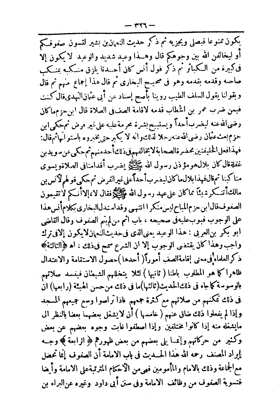 قَالَ وَهَذَا وَعِيدٌ شَدِيدٌ وَالْوَعِيدُ لَا يَكُونُ إلَّا فِي كَبِيرَةٍ مِنْ الْكَبَائِرِ ثُمَّ ذَكَرَ قَوْلَ أَنَسٍ كَانَ أَحَدُنَا يُلْزِقُ مَنْكِبَهُ بِمَنْكِبِ صَاحِبِهِ وَقَدَمَهُ بِقَدَمِهِ وَهُوَ فِي صَحِيحِ الْبُخَارِيِّ ثُمَّ قَالَ هَذَا إجْمَاعٌ مِنْهُمْ ثُمَّ قَالَ وَبِقَوْلِنَا يَقُولُ السَّلَفُ الطَّيِّبُ رَوَيْنَا بِأَصَحِّ إسْنَادٍ عَنْ أَبِي عُثْمَانَ النَّهْدِيِّ قَالَ كُنْت فِيمَنْ ضَرَبَ عُمَرُ بْنُ الْخَطَّابِ قَدَمَهُ لِإِقَامَةِ الصَّفِّ فِي الصَّلَاةِ قَالَ ابْنُ حَزْمٍ مَا كَانَ - رَضِيَ اللَّهُ عَنْهُ - لِيَضْرِبَ أَحَدًا وَيَسْتَبِيحَ بَشَرَةً مُحَرَّمَةً عَلَيْهِ عَلَى غَيْرِ فَرْضٍ ثُمَّ حَكَى ابْنُ حَزْمٍ بَعَثَ عُثْمَانَ - رَضِيَ اللَّهُ عَنْهُ - رَجُلًا لِذَلِكَ وَأَنَّهُ لَا يُكَبِّرُ حَتَّى يُخْبِرُوهُ بِاسْتِوَائِهَا ثُمَّ قَالَ: فَهَذَا فِعْلُ الْخَلِيفَتَيْنِ بِحَضْرَةِ الصَّحَابَةِ لَا يُخَالِفُهُمْ فِي ذَلِكَ أَحَدٌ مِنْهُمْ ثُمَّ حَكَى عَنْ سُوَيْد بْنِ غَفَلَةَ قَالَ كَانَ بِلَالٌ هُوَ مُؤَذِّنُ رَسُولِ اللَّهِ - صَلَّى اللَّهُ عَلَيْهِ وَسَلَّمَ - يَضْرِبُ أَقْدَامَنَا فِي الصَّلَاةِ وَيُسَوِّي مَنَاكِبَنَا.