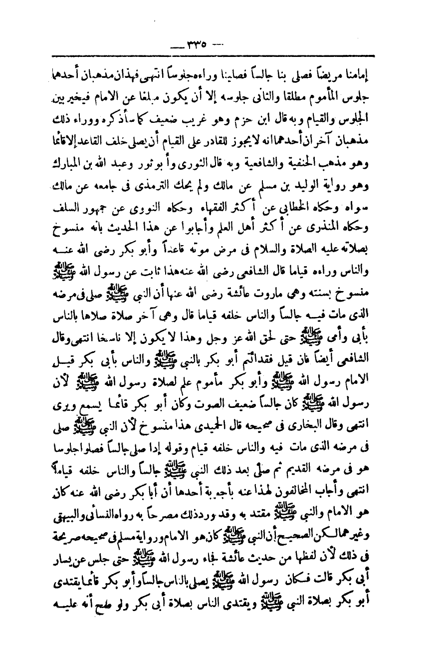 وَأَجَابَ الْمُخَالِفُونَ لِهَذَا عَنْهُ بِأَجْوِبَةٍ أَحَدُهَا أَنَّ أَبَا بَكْرٍ - رَضِيَ اللَّهُ عَنْهُ - كَانَ هُوَ الْإِمَامُ وَالنَّبِيَّ - صَلَّى اللَّهُ عَلَيْهِ وَسَلَّمَ - مُقْتَدٍ بِهِ وَقَدْ وَرَدَ ذَلِكَ مُصَرَّحًا بِهِ رَوَاهُ النَّسَائِيّ وَالْبَيْهَقِيُّ وَغَيْرُهُمَا لَكِنَّ الصَّحِيحَ أَنَّ النَّبِيَّ - صَلَّى اللَّهُ عَلَيْهِ وَسَلَّمَ - كَانَ هُوَ الْإِمَامُ وَرِوَايَةُ مُسْلِمٍ فِي صَحِيحِهِ صَرِيحَةٌ فِي ذَلِكَ لِأَنَّ لَفْظَهَا مِنْ حَدِيثِ عَائِشَةَ «فَجَاءَ رَسُولُ اللَّهِ - صَلَّى اللَّهُ عَلَيْهِ وَسَلَّمَ - حَتَّى جَلَسَ عَنْ يَسَارِ أَبِي بَكْرٍ قَالَتْ فَكَانَ رَسُولُ اللَّهِ - صَلَّى اللَّهُ عَلَيْهِ وَسَلَّمَ - يُصَلِّي بِالنَّاسِ جَالِسًا وَأَبُو بَكْرٍ قَائِمًا يَقْتَدِي أَبُو بَكْرٍ بِصَلَاةِ النَّبِيِّ - صَلَّى اللَّهُ عَلَيْهِ وَسَلَّمَ - وَيَقْتَدِي النَّاسُ بِصَلَاةِ أَبِي بَكْرٍ» .