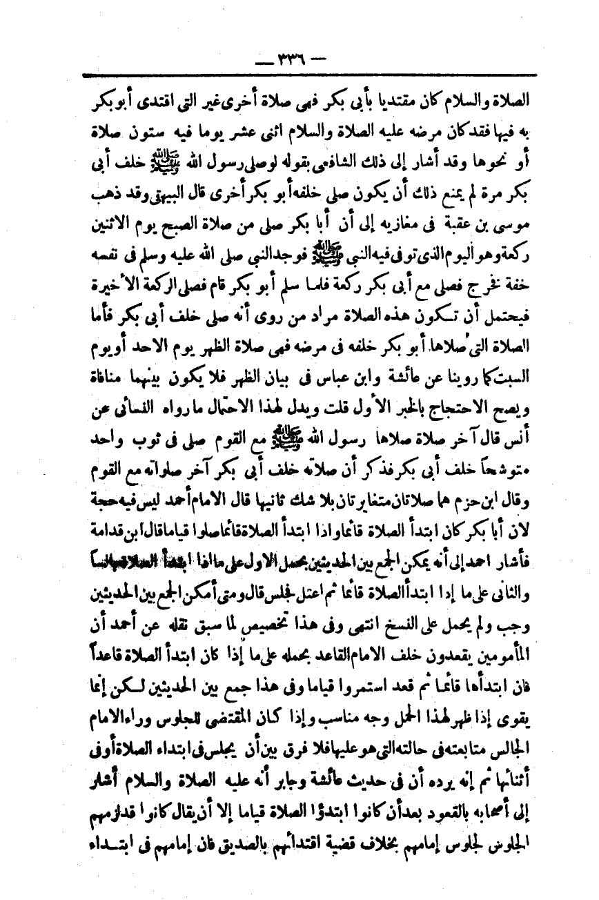 فَذَكَرَ أَنَّ صَلَاتَهُ خَلْفَ أَبِي بَكْرٍ آخِرُ صَلَوَاتِهِ مَعَ الْقَوْمِ وَقَالَ ابْنُ حَزْمٍ هُمَا صَلَاتَانِ مُتَغَايِرَتَانِ بِلَا شَكٍّ ثَانِيهَا قَالَ الْإِمَامُ أَحْمَدُ لَيْسَ فِيهِ حُجَّةٌ لِأَنَّ أَبَا بَكْرٍ كَانَ ابْتَدَأَ الصَّلَاةَ قَائِمًا وَإِذَا ابْتَدَأَ الصَّلَاةَ قَائِمًا صَلُّوا قِيَامًا قَالَ ابْنُ قُدَامَةَ فَأَشَارَ أَحْمَدُ إلَى أَنَّهُ يُمْكِنُ الْجَمْعُ بَيْنَ الْحَدِيثَيْنِ بِحَمْلِ الْأَوَّلِ عَلَى مَا إذَا ابْتَدَأَ الصَّلَاةَ جَالِسًا وَالثَّانِي عَلَى مَا إذَا ابْتَدَأَ الصَّلَاةَ قَائِمًا ثُمَّ اعْتَلَّ فَجَلَسَ قَالَ وَمَتَى أَمْكَنَ الْجَمْعُ بَيْنَ الْحَدِيثَيْنِ وَجَبَ وَلَمْ يُحْمَلْ عَلَى النَّسْخِ انْتَهَى.