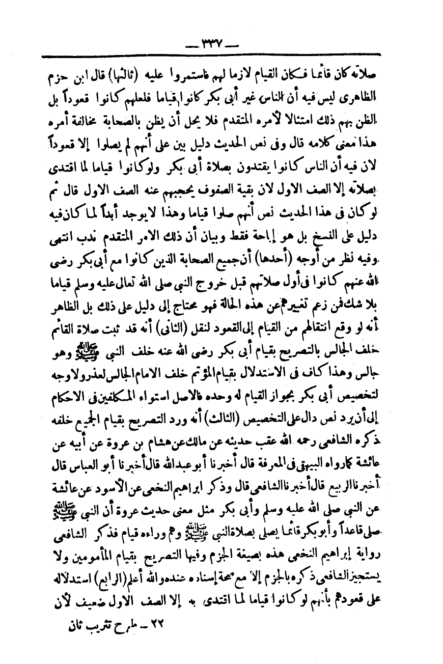 (ثَالِثُهَا) قَالَ ابْنُ حَزْمٍ الظَّاهِرِيُّ لَيْسَ فِيهِ أَنَّ النَّاسَ غَيْرَ أَبِي بَكْرٍ كَانُوا قِيَامًا فَلَعَلَّهُمْ كَانُوا قُعُودًا بَلْ الظَّنُّ بِهِمْ ذَلِكَ امْتِثَالًا لِأَمْرِهِ الْمُتَقَدِّمِ فَلَا يَحِلُّ أَنْ يُظَنَّ بِالصَّحَابَةِ مُخَالِفَةَ أَمْرِهِ هَذَا مَعْنَى كَلَامِهِ قَالَ وَفِي نَصِّ الْحَدِيثِ دَلِيلٌ بَيِّنٌ عَلَى أَنَّهُمْ لَمْ يُصَلُّوا إلَّا قُعُودًا لِأَنَّ فِيهِ أَنَّ النَّاسَ كَانُوا يَقْتَدُونَ بِصَلَاةِ أَبِي بَكْرٍ وَلَوْ كَانُوا قِيَامًا لَمَا اقْتَدَى بِصَلَاتِهِ إلَّا الصَّفُّ الْأَوَّلُ لِأَنَّ بَقِيَّةَ الصُّفُوفِ يَحْجُبُهُمْ عَنْهُ الصَّفُّ الْأَوَّلُ قَالَ ثُمَّ لَوْ كَانَ فِي هَذَا الْحَدِيثِ نَصٌّ أَنَّهُمْ صَلَّوْا قِيَامًا وَهَذَا لَا يُوجَدُ أَبَدًا لَمَا كَانَ فِيهِ دَلِيلٌ عَلَى النَّسْخِ بَلْ هُوَ إبَاحَةٌ فَقَطْ وَبَيَانٌ أَنَّ ذَلِكَ الْأَمْرَ الْمُتَقَدِّمَ نَدْبٌ انْتَهَى.