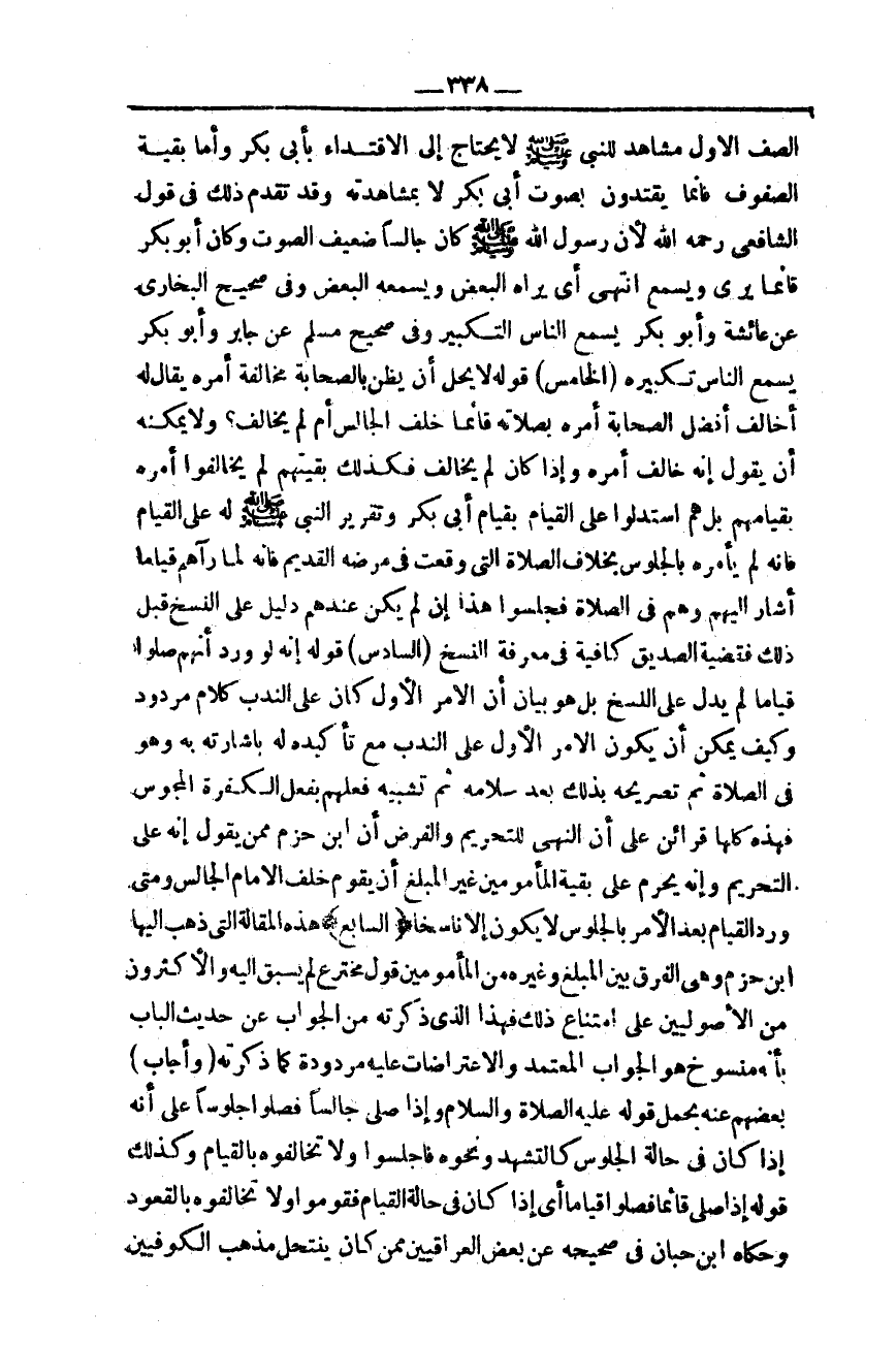 (السَّادِسُ) قَوْلُهُ إنَّهُ لَوْ وَرَدَ أَنَّهُمْ صَلَّوْا قِيَامًا لَمْ يَدُلَّ عَلَى النَّسْخِ بَلْ هُوَ بَيَانٌ أَنَّ الْأَمْرَ الْأَوَّلَ كَانَ عَلَى النَّدْبِ كَلَامٌ مَرْدُودٌ وَكَيْفَ يُمْكِنُ أَنْ يَكُونَ الْأَمْرُ الْأَوَّلُ عَلَى النَّدْبِ مَعَ تَأْكِيدِهِ لَهُ بِإِشَارَتِهِ بِهِ وَهُوَ فِي الصَّلَاةِ ثُمَّ تَصْرِيحِهِ بِذَلِكَ بَعْدَ سَلَامِهِ ثُمَّ تَشْبِيهِ فِعْلِهِمْ بِفِعْلِ الْكَفَرَةِ الْمَجُوسِ فَهَذِهِ كُلُّهَا قَرَائِنُ عَلَى أَنَّ النَّهْيَ لِلتَّحْرِيمِ. وَالْفَرْضُ أَنَّ ابْنَ حَزْمٍ مِمَّنْ يَقُولُ إنَّهُ عَلَى التَّحْرِيمِ وَإِنَّهُ يَحْرُمُ عَلَى بَقِيَّةِ الْمَأْمُومِينَ غَيْرِ الْمُبَلِّغِ أَنْ يَقُومَ خَلْفَ الْإِمَامِ الْجَالِسِ وَمَتَى وَرَدَ الْقِيَامُ بَعْدَ الْأَمْرِ بِالْجُلُوسِ لَا يَكُونُ إلَّا نَاسِخًا.